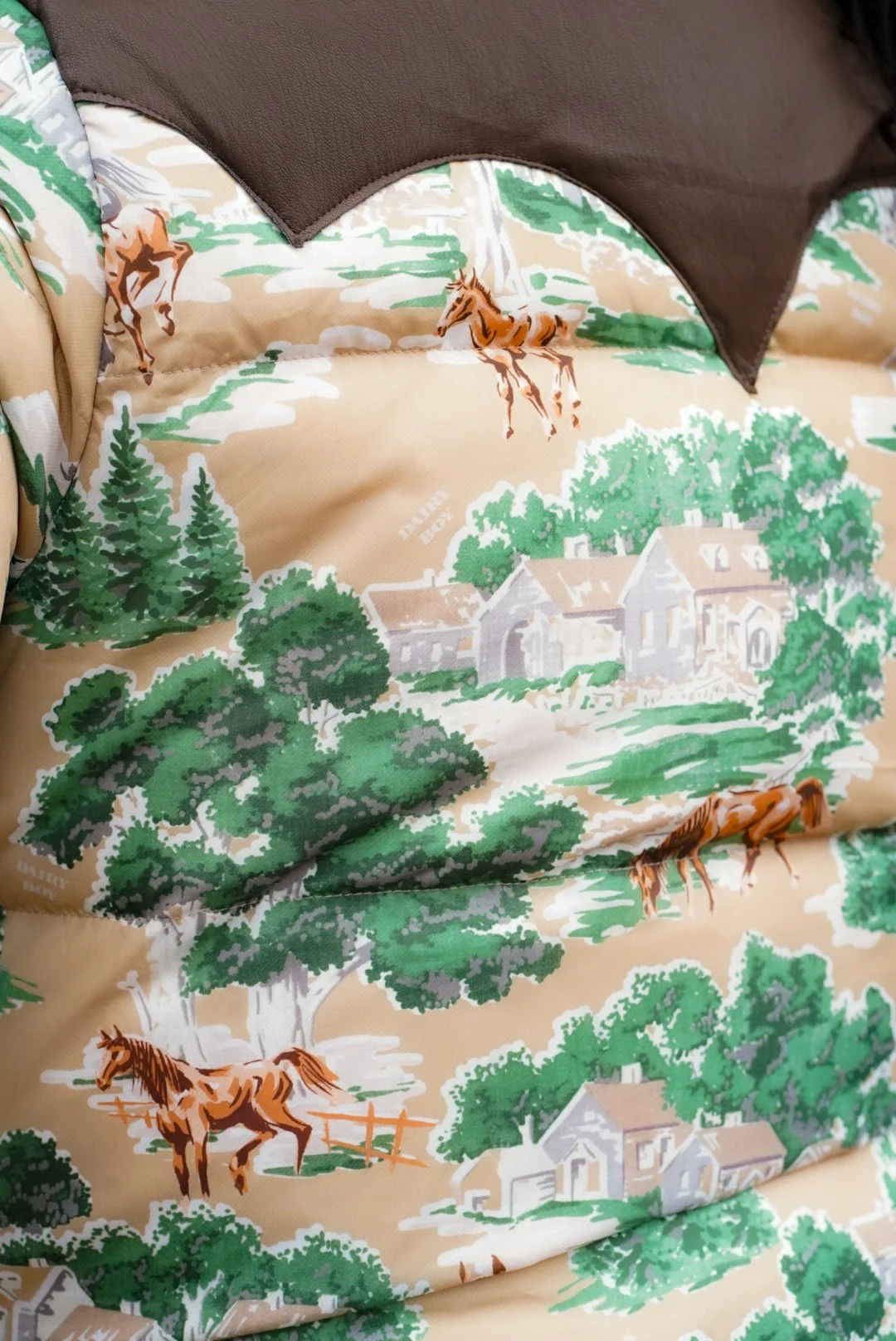 This Dairy Boy horse puffer caught my eye over the holidays, and there felt like no better way to showcase it than with a farm shoot—especially given the brand’s roots. Founded by Paige Lorenze, Dairy Boy draws heavily from Americana, sport, and rural life, making the setting feel natural rather than overly styled. The horse print and earthy color palette paired effortlessly with the wood fencing and open land, allowing the jacket to stand out without feeling forced.