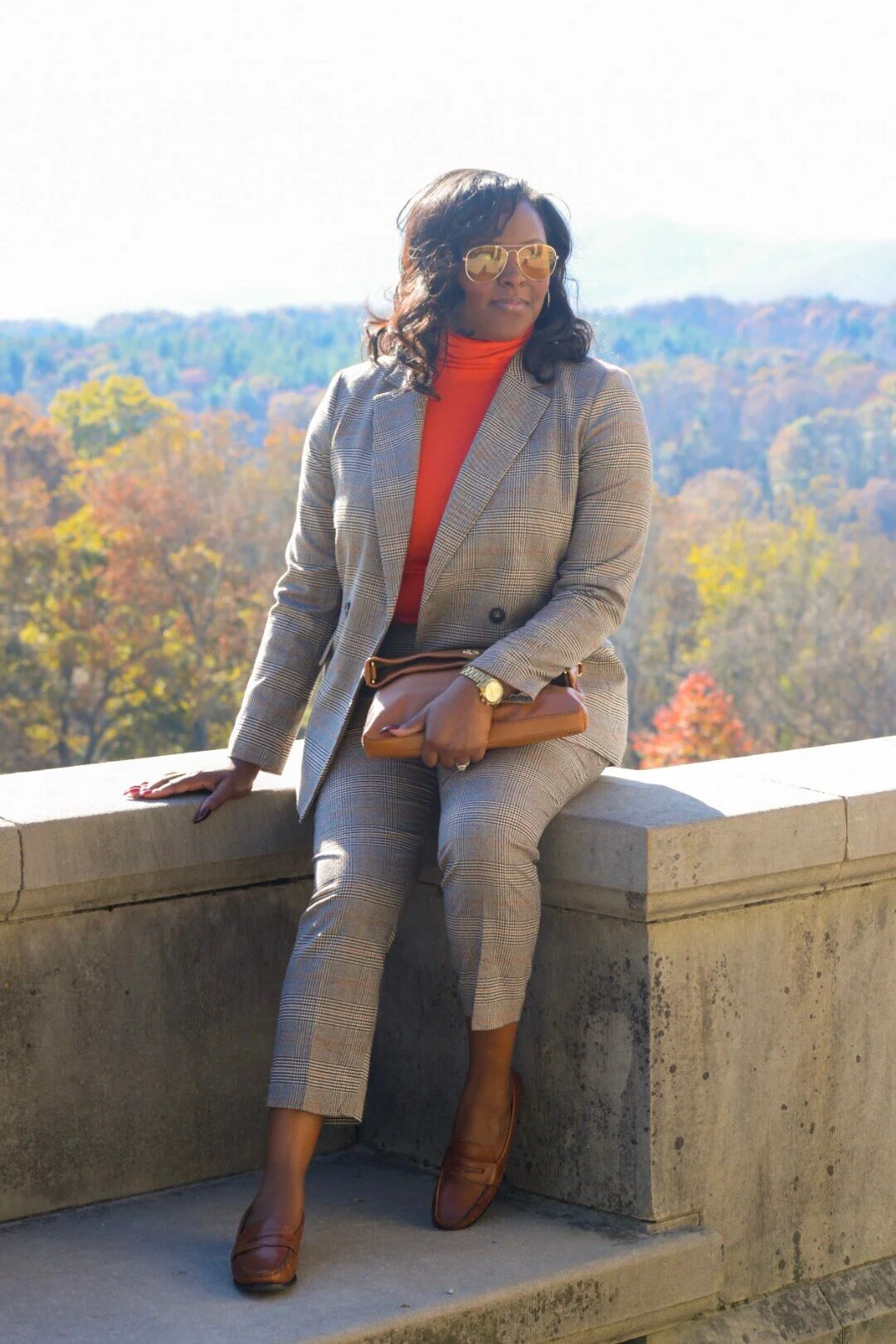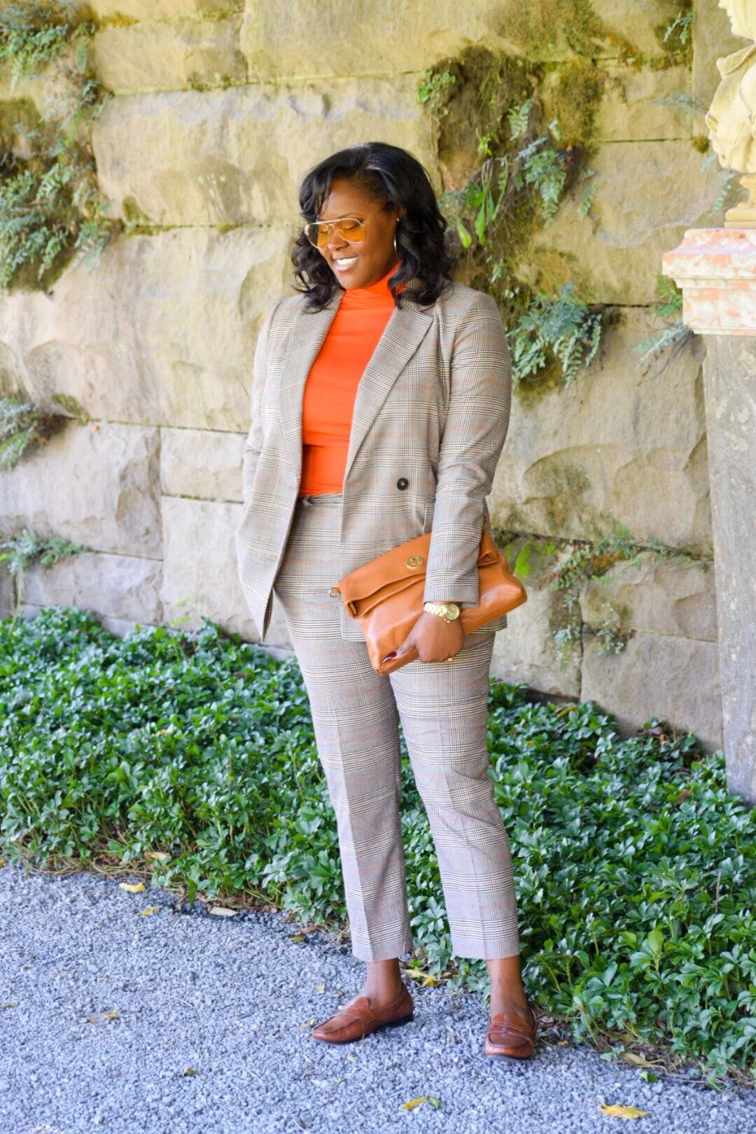 H&M Plaid Jacket (similar here) & Slacks, Cole Haan Loafers (old), Orange Turtleneck, Yellow Sunnies, Tory Burch Clutch (old), Chanel Signet Ring