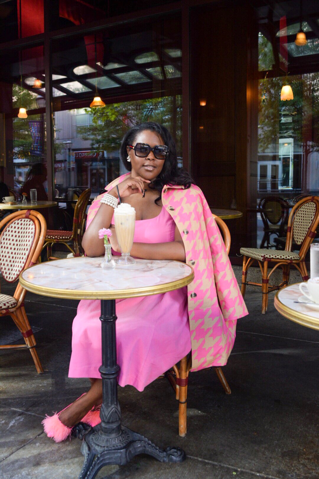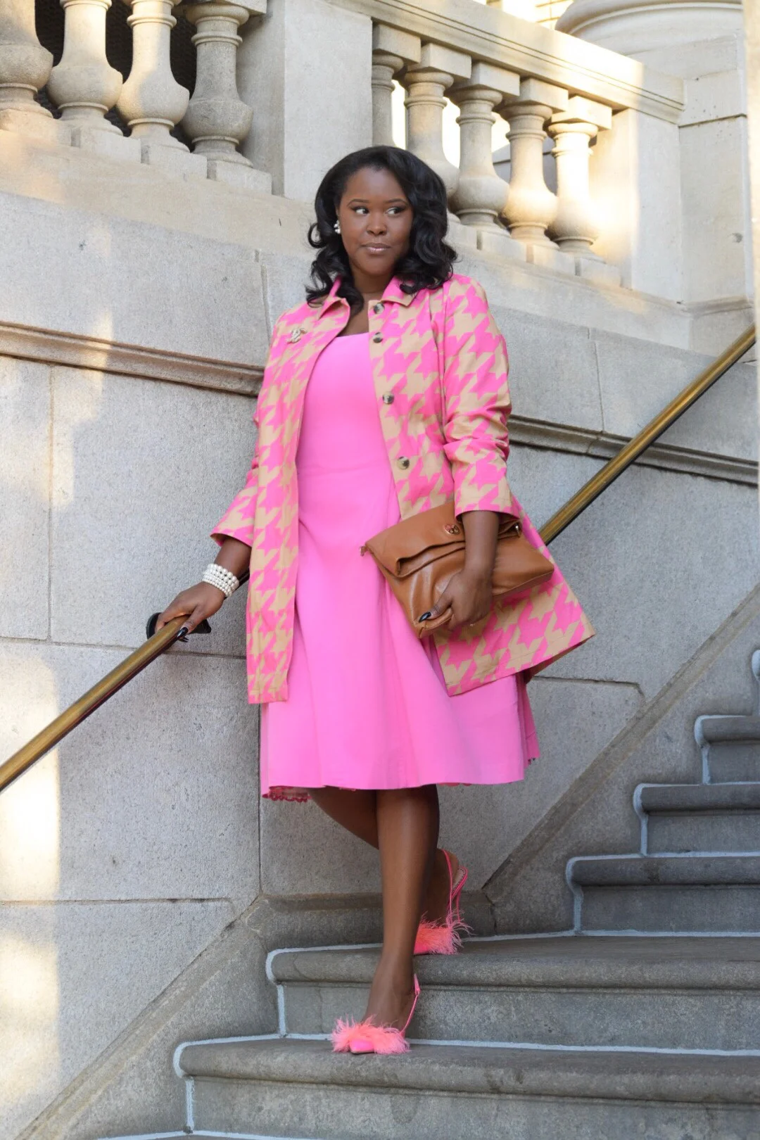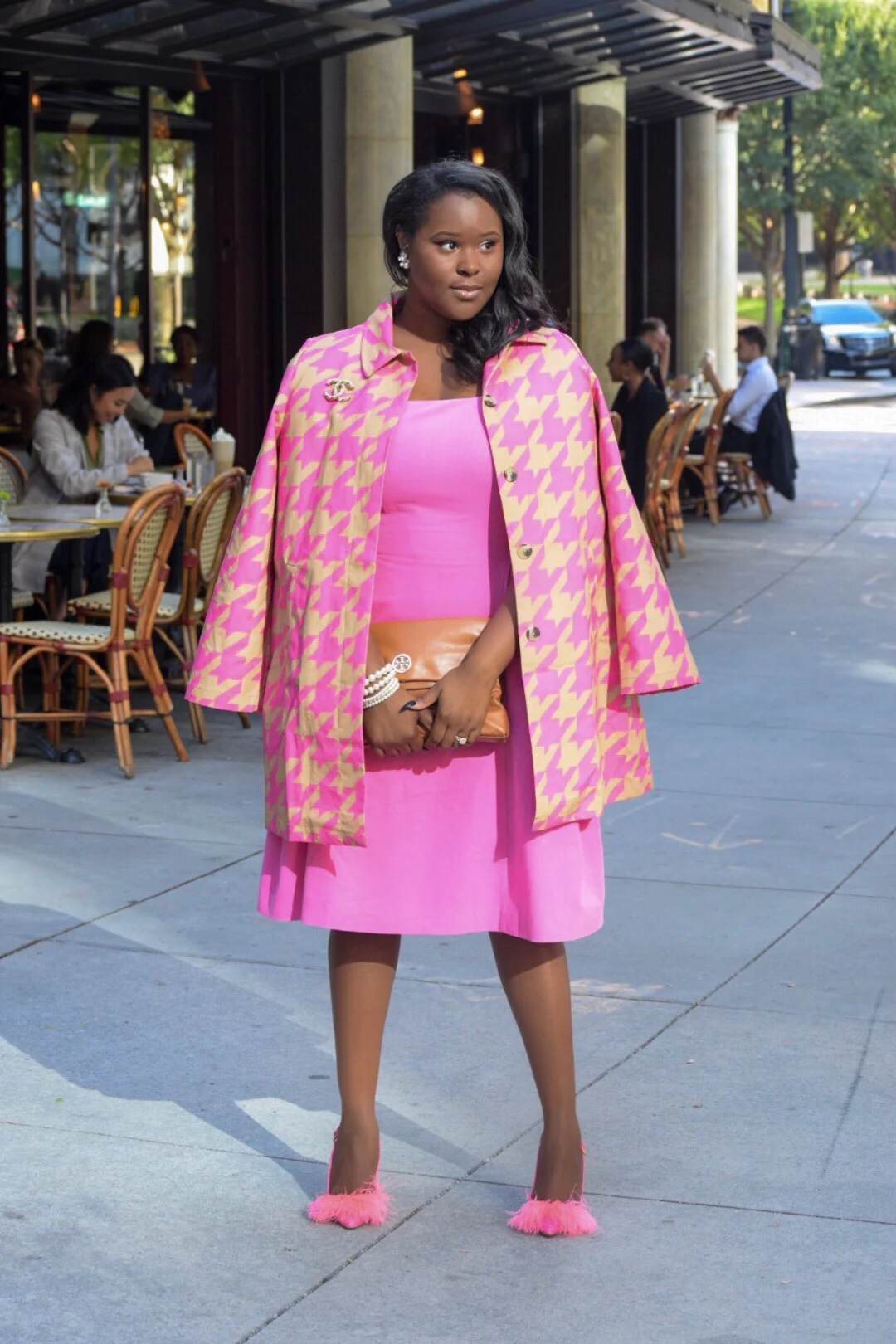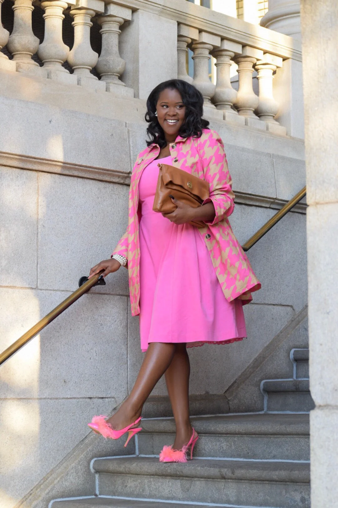 Even though it’s hot, this is still a transitional wardrobe period (whatever that means). I am wearing this amazing corduroy dress and jacket by Isaac Mizrahi x Target collaboration. The bright pink screams summer, however the heavier fabric is very Fall. And I love wearing bright colors for all seasons! I paired it with my favorite Moschino feathered heels. I got so many compliments wearing this outfit! I felt like Barbie for the day!