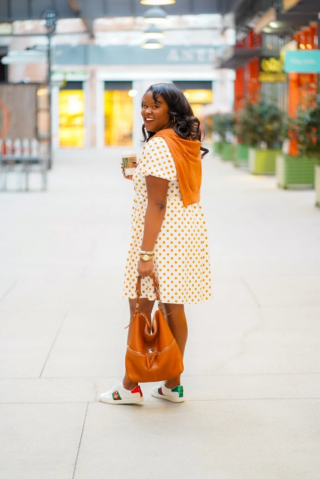 For a lot of people, Fall means changing leaves, layers, holidays etc…BUT! It also means Pumpkin Spice Lattes! Now, I’m not a huge fan of the PSL, but I can’t help but buy at least one each season. So…. since it’s an annual event, I definitely have to dress the part! To go buy my first 2020 PSL, I wore this gifted Nostalchicks polka dress! Even though its fall, here in GA it still gets better warm, so I paired it with a matching cardigan in case I get cold. Throw on my fave Gucci sneakers and a Dooney hobo bag…I’m PSL Good to Go!
