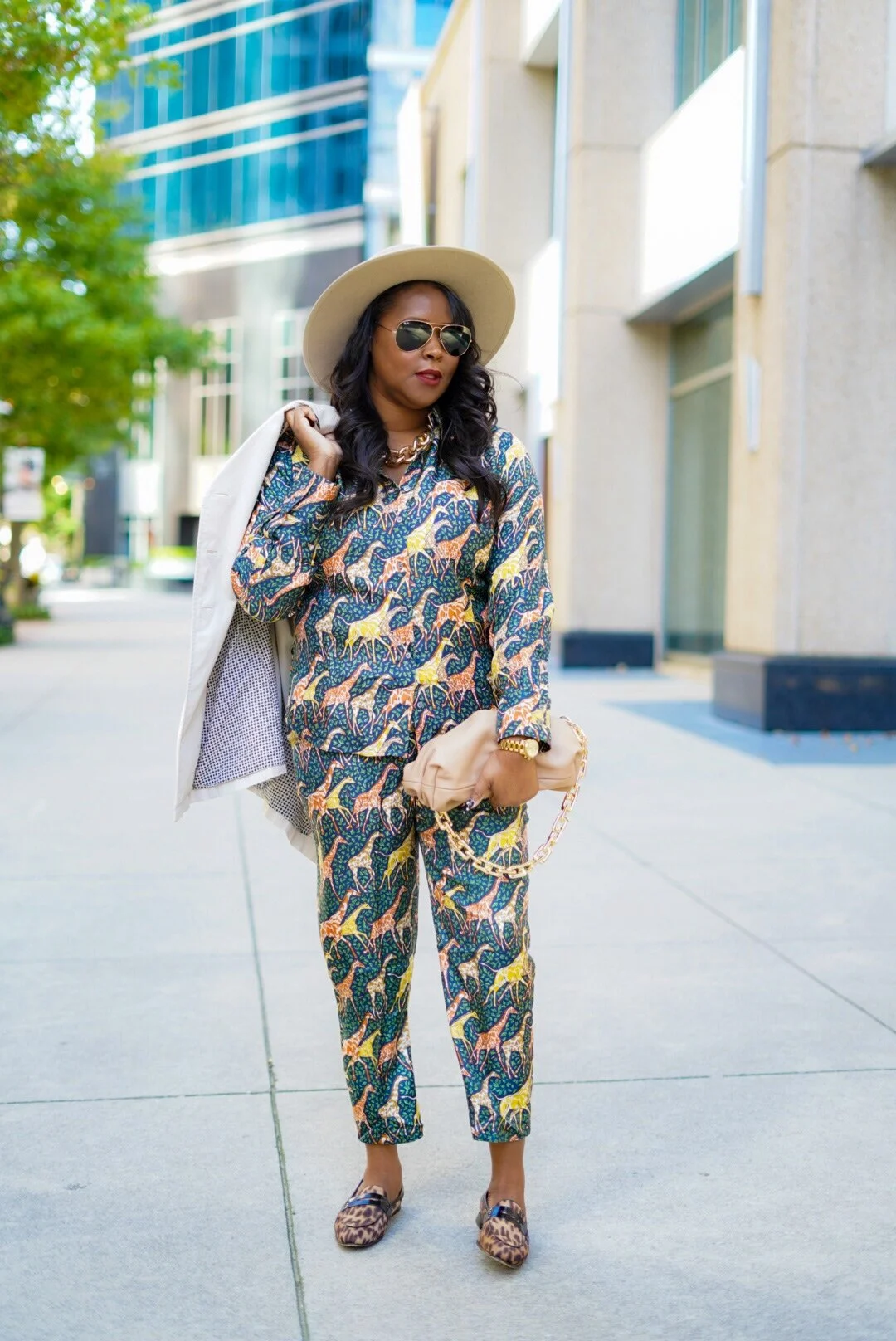 Hi Dolls! I finally think 2020 is looking up! I’ve seen and gotten good news recently, AND! I got this J Crew Collection outfit on sale! I randomly went to the mall during a lunch break last week and saw this amazing outfit on the sales rack with an additional 50% off. I have always been a fan of their printed silk pieces. This look screams fall to me and it’s comfortable yet chic. This is my version of what athleleisure/the pajama trend should be…lol! I paired this giraffe print with a chunky gold necklace, cheetah loafers and favorite wide brim hat.