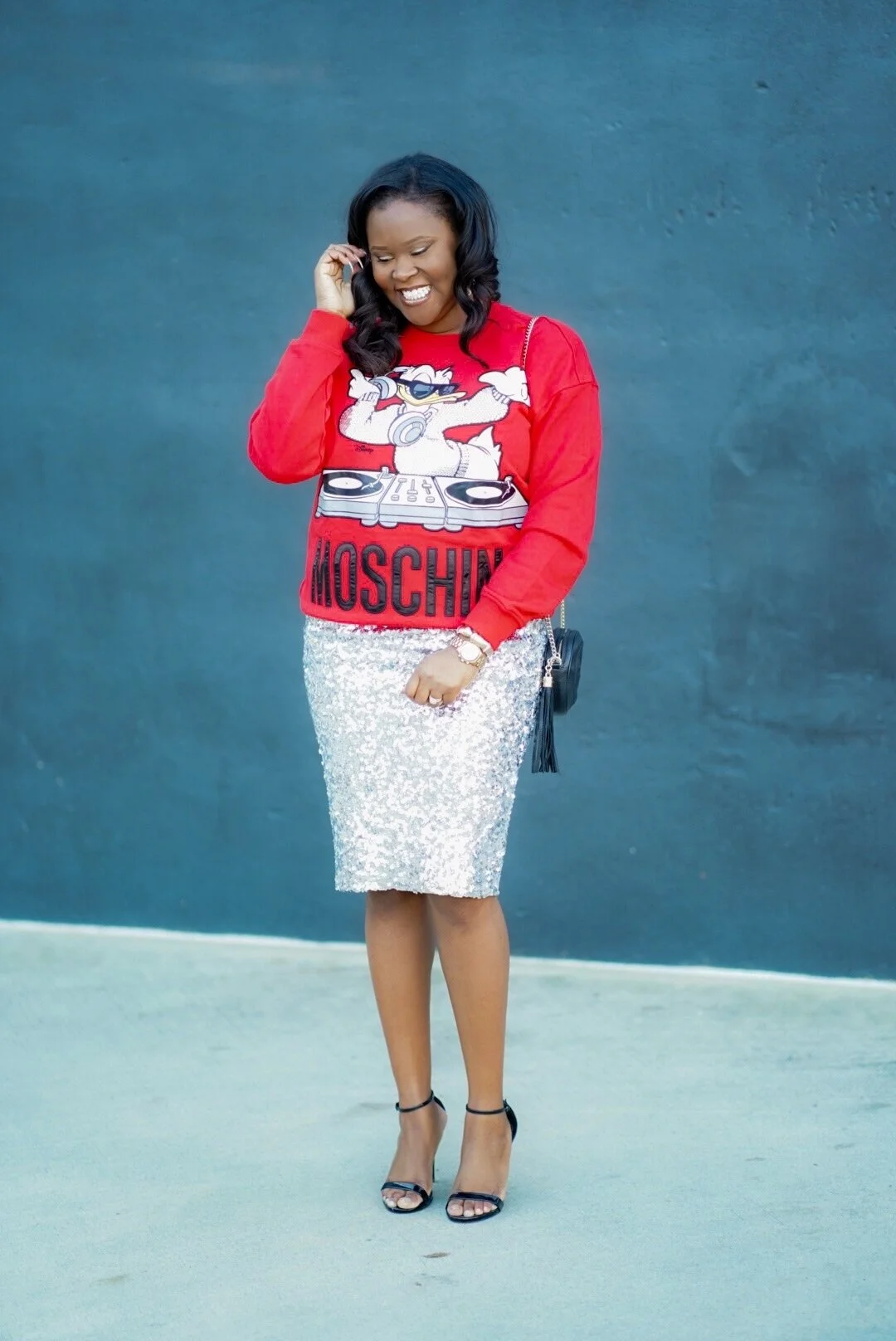If I was going out this year, I would definitely be rocking this Moschino x H&M sweatshirt. The Moschino x H&M came out a couple of years ago; my mom got me some pieces for Christmas that year. However, I was dead broke and couldn't shop the collection for myself at the time. So, thanks to websites like Vestiaire Collective, I have been collecting pieces more and more. To be more specific, the Disney related items in the collection. I purchased this Donald Duck DJ sweatshirt back in February and I’ve been dying to wear it! I paired it with a sequin skirt to match Donalds shirt, and some rhinestone earrings, a Gucci bag and some strappy heels….I think I’m ready to ring in the New Year!