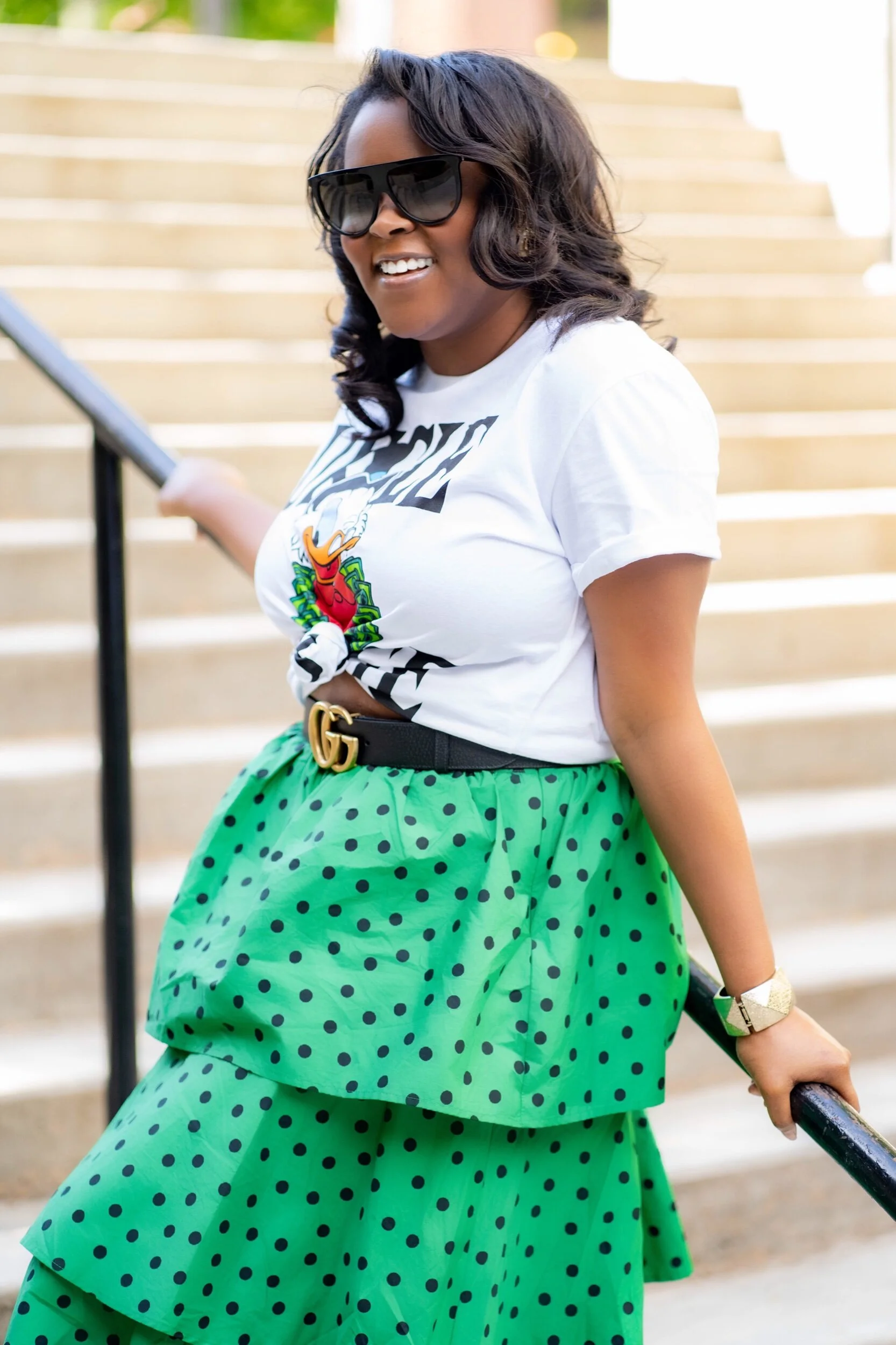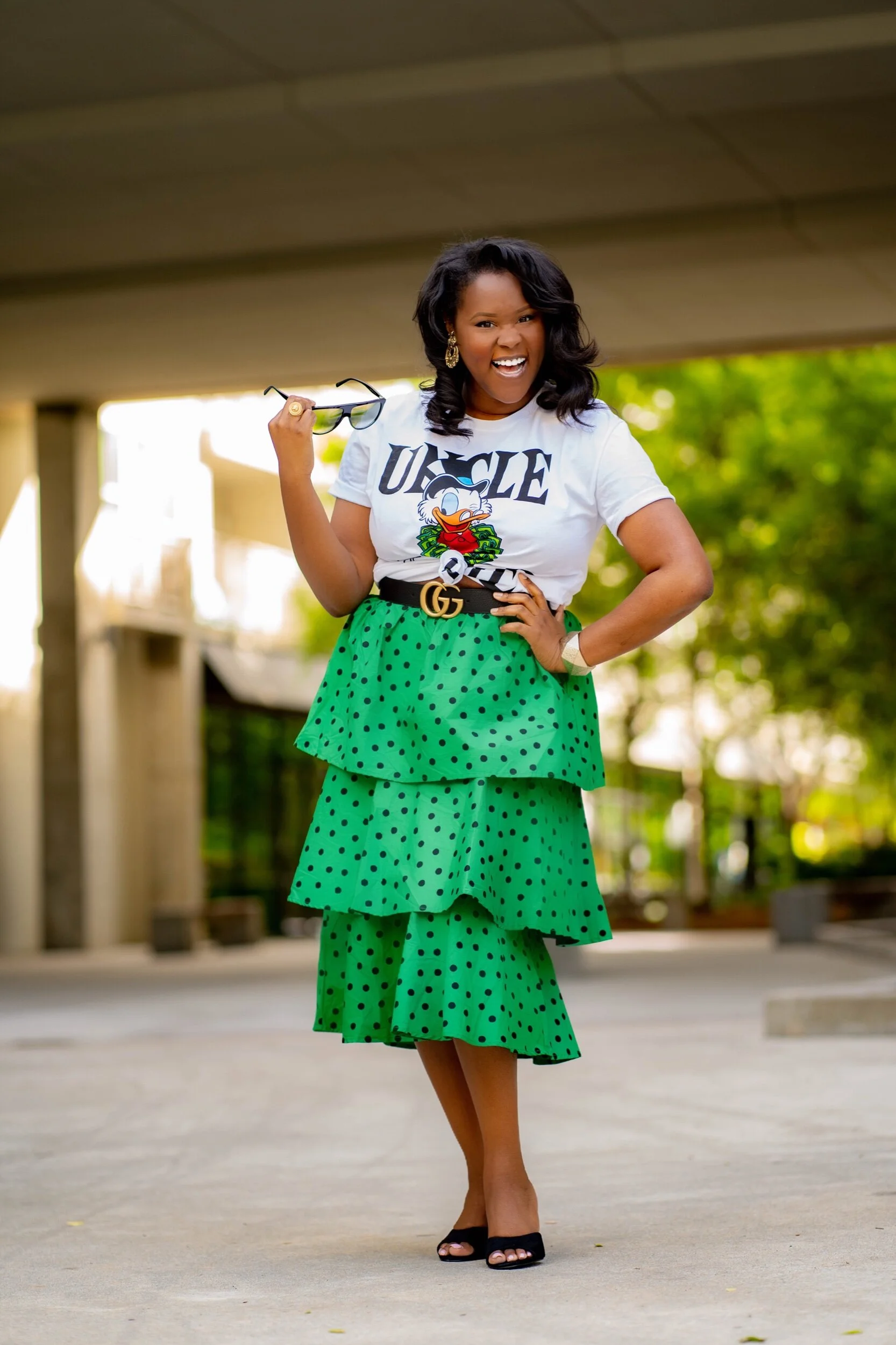 It’s the last look of the Target Birthday Week series! And it wouldn’t be a birthday week without incorporating some Disney too! This look is by far one my favorite looks I’ve done recently! I honestly feel/felt that Carrie Bradshaw would have definitely worn this. This skirt is from The Who What Wear collection at Target. It’s so much fun and even comes with a matching top. Now I love a good co-ord set, but I decided to only purchase the skirt. I paired it with my favorite Scrooge McDuck shirt, a Gucci belt, Celine Sunnies and some vintage earrings from my Mom! All my outfit deets are listed below.