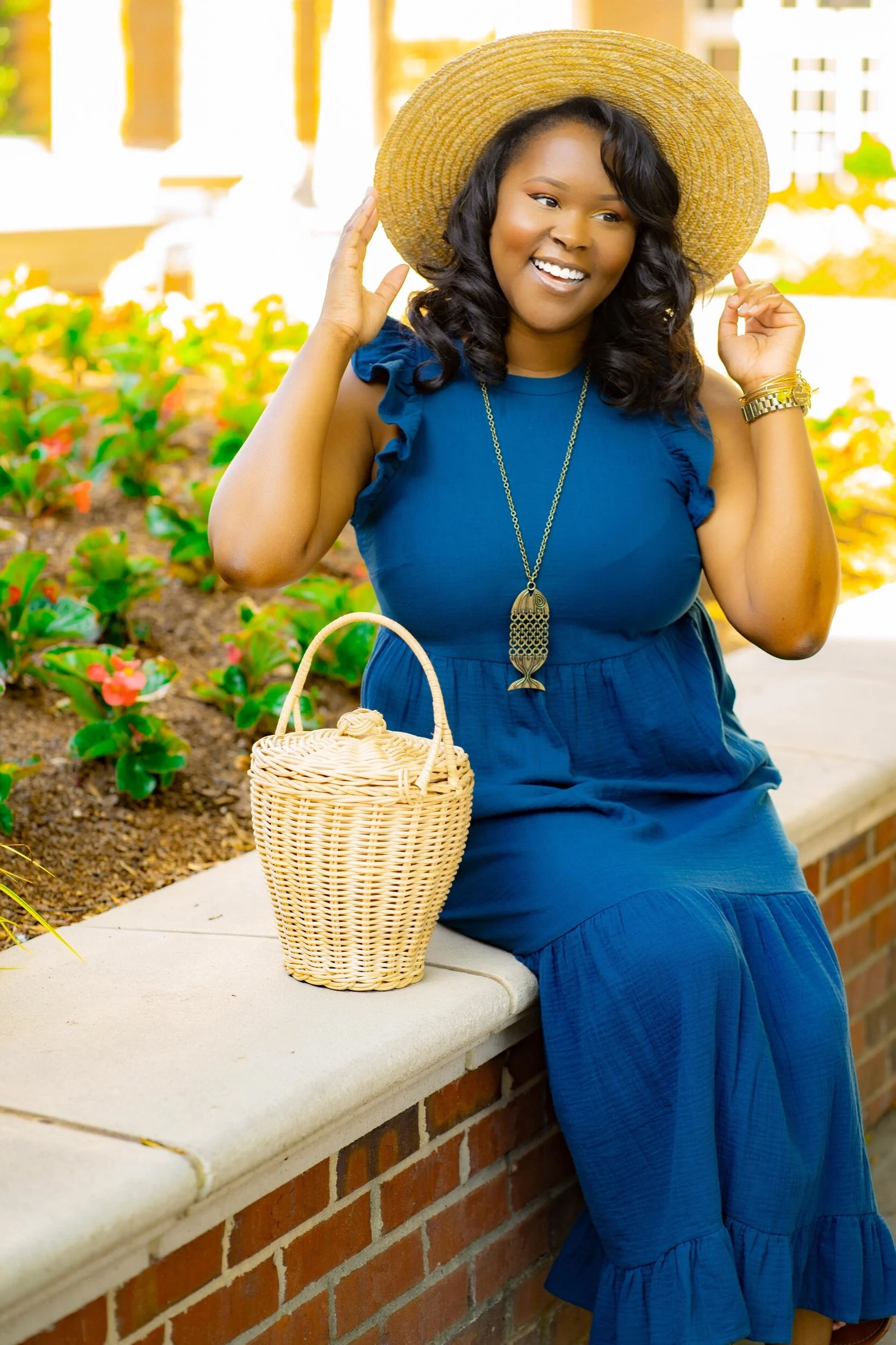 This adorable dress comes in five different colors and only cost $34.99. I think it is great for Spring and Summer. And! I instantly fell in love with the frilled sleeves. I am wearing a medium in the color blue (I also want it in pink). This color is so beautiful, it’s a more rich navy tone then your run of the mill blue. I paired it with my favorite basket purse and straw hat (both from Urban Outfitters), Tory Burch Miller sandals, and a Forever 21 necklace. I have tried my best to link everything (or something similar) that I am wearing at the bottom. I hope you guys enjoy this next series!