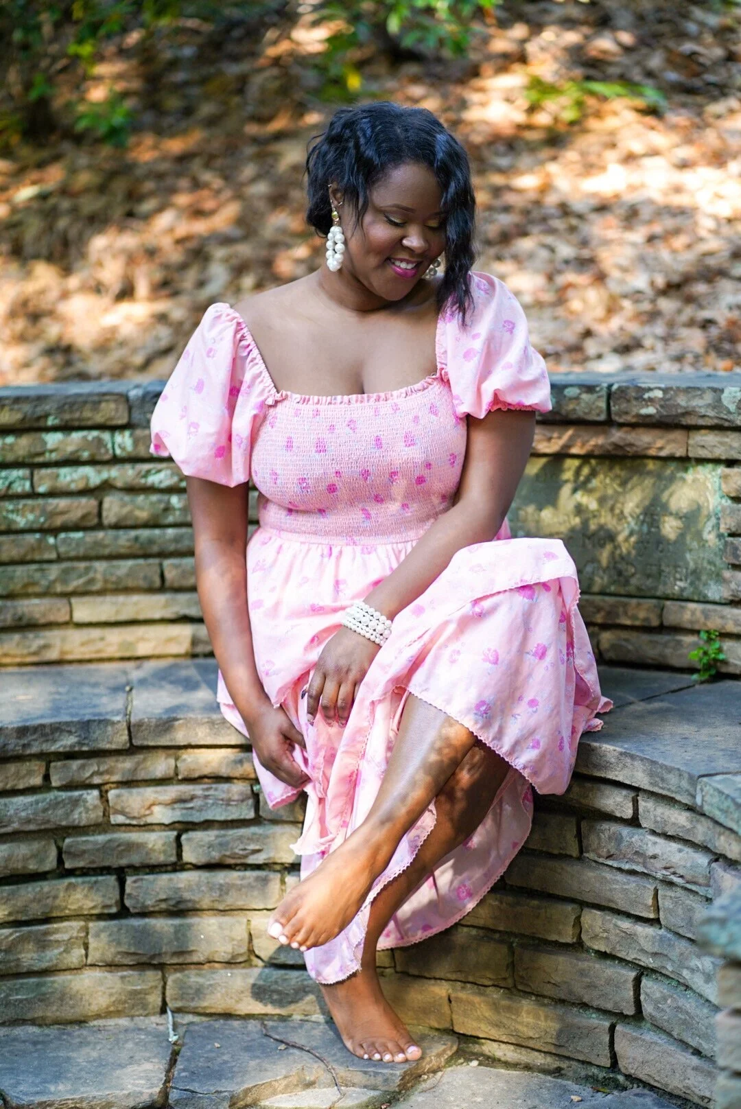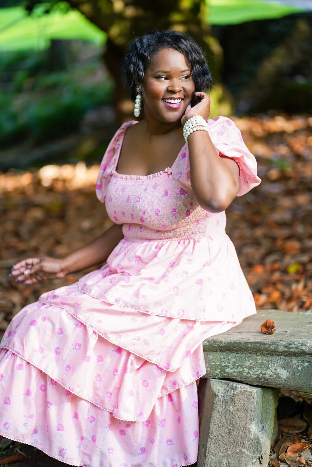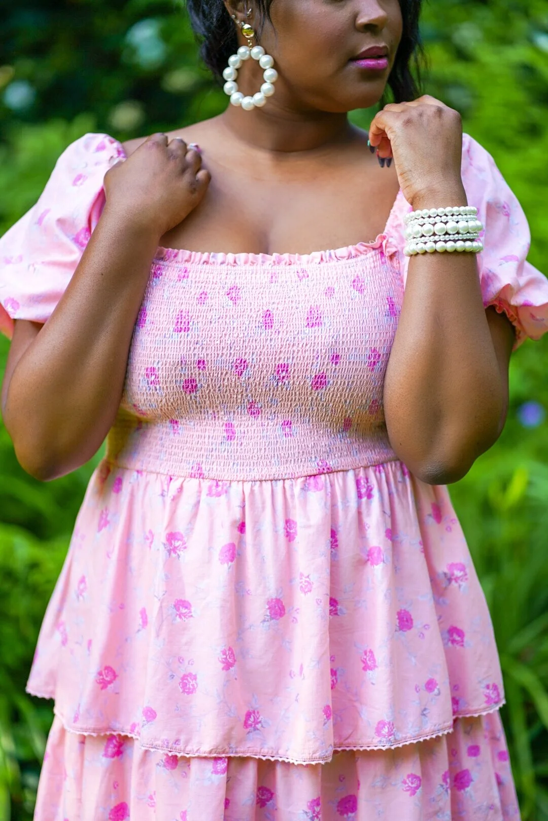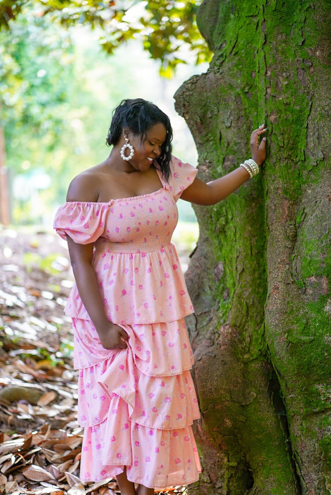 The first dress that caught my eye was the Simone Dress. I loved the pink/salmon color with hot pink and lilac flowers on it. I saw it, and I knew I had to get it. When it arrived, I put in on and didn’t want to take it off. Besides the layers on the bottom and the print….I love a good puff sleeve. Puff sleeves are my jam! You can wear this dress (and a lot of the collections dresses) either on or off the shoulder. What is great about that is, it changes the look (two looks for one). Just for reference, I’m wearing a medium, but I think I could have fit into a small as well.