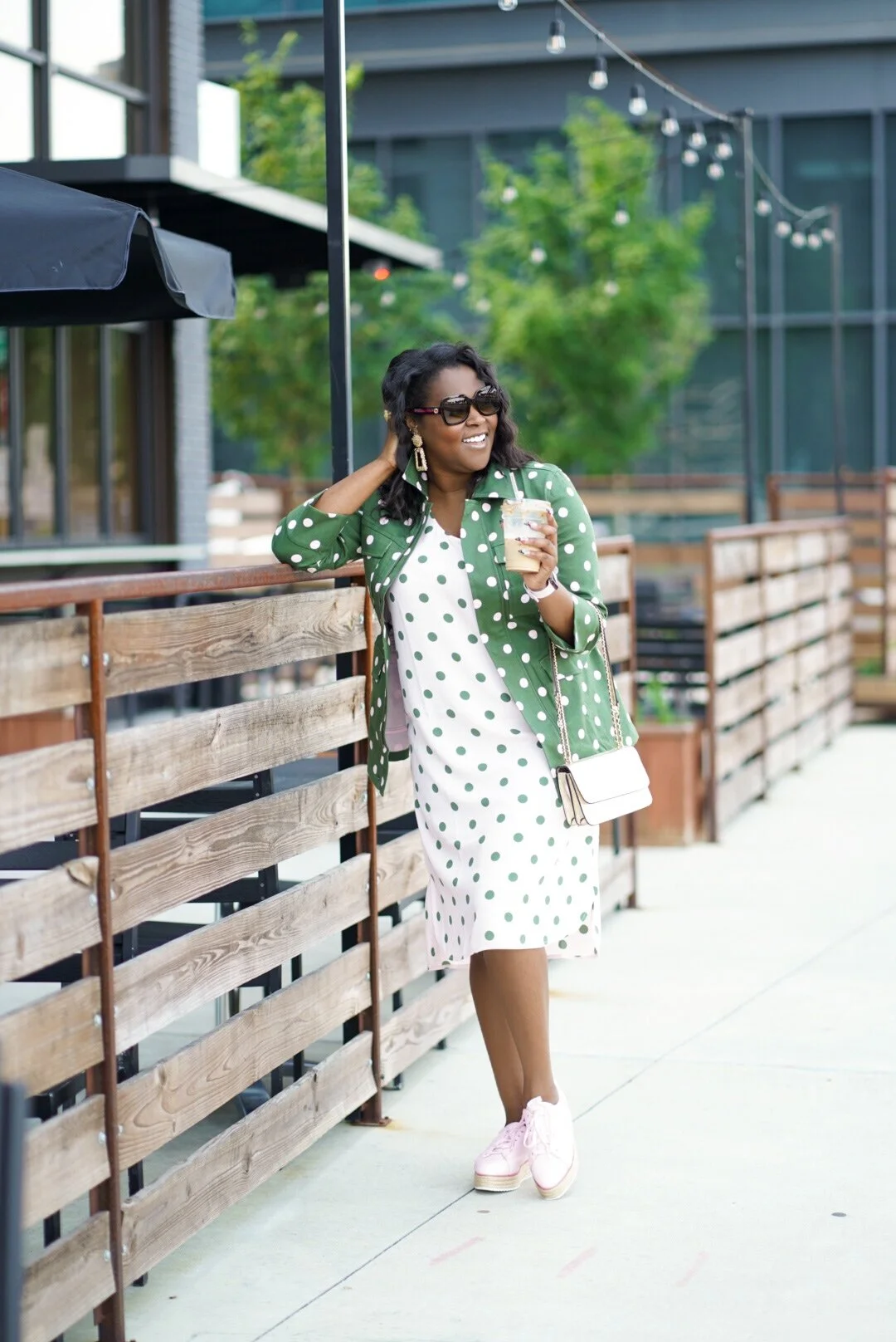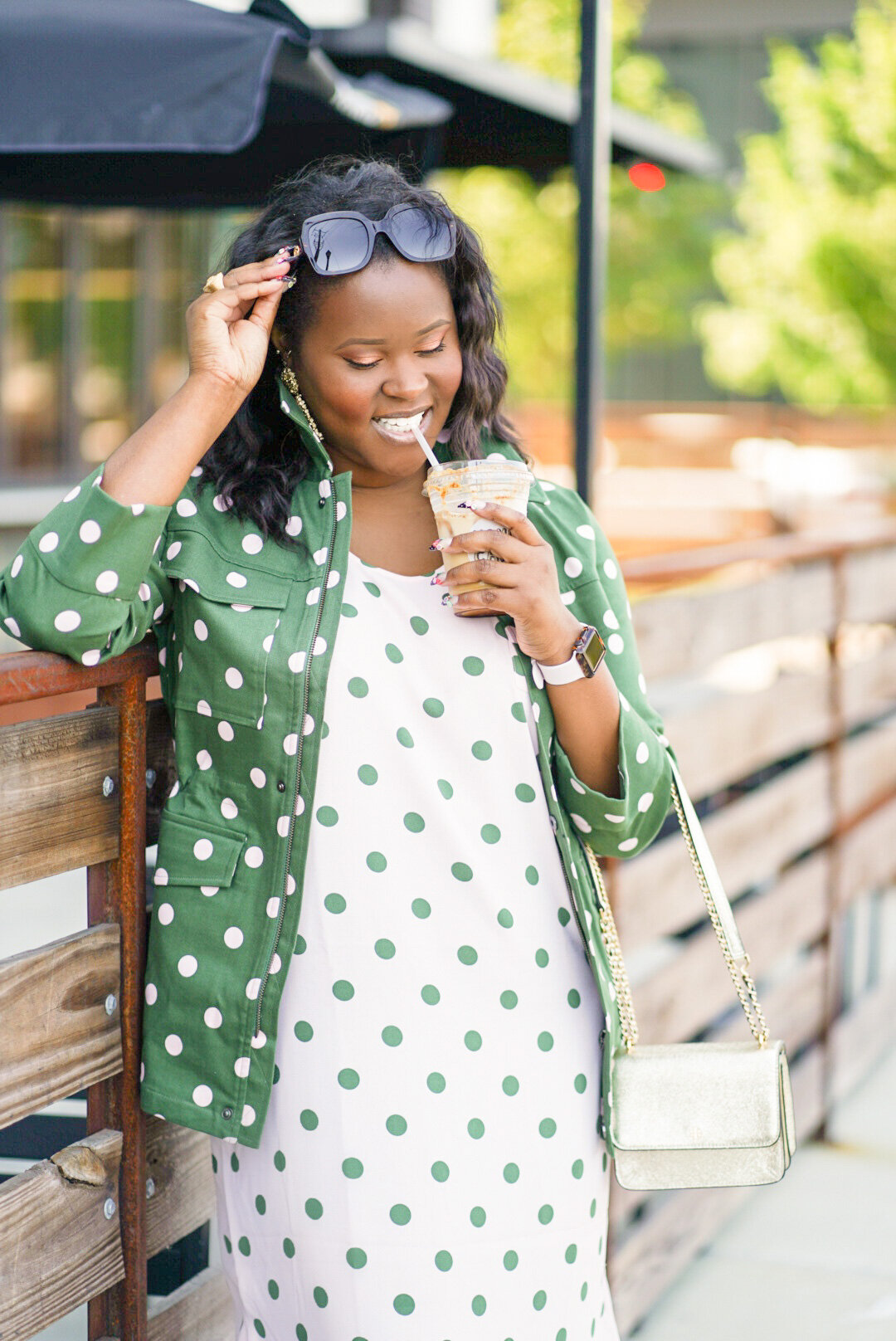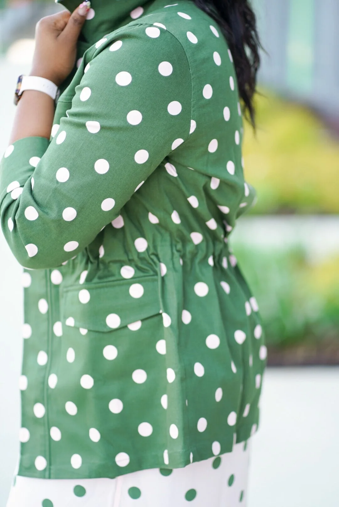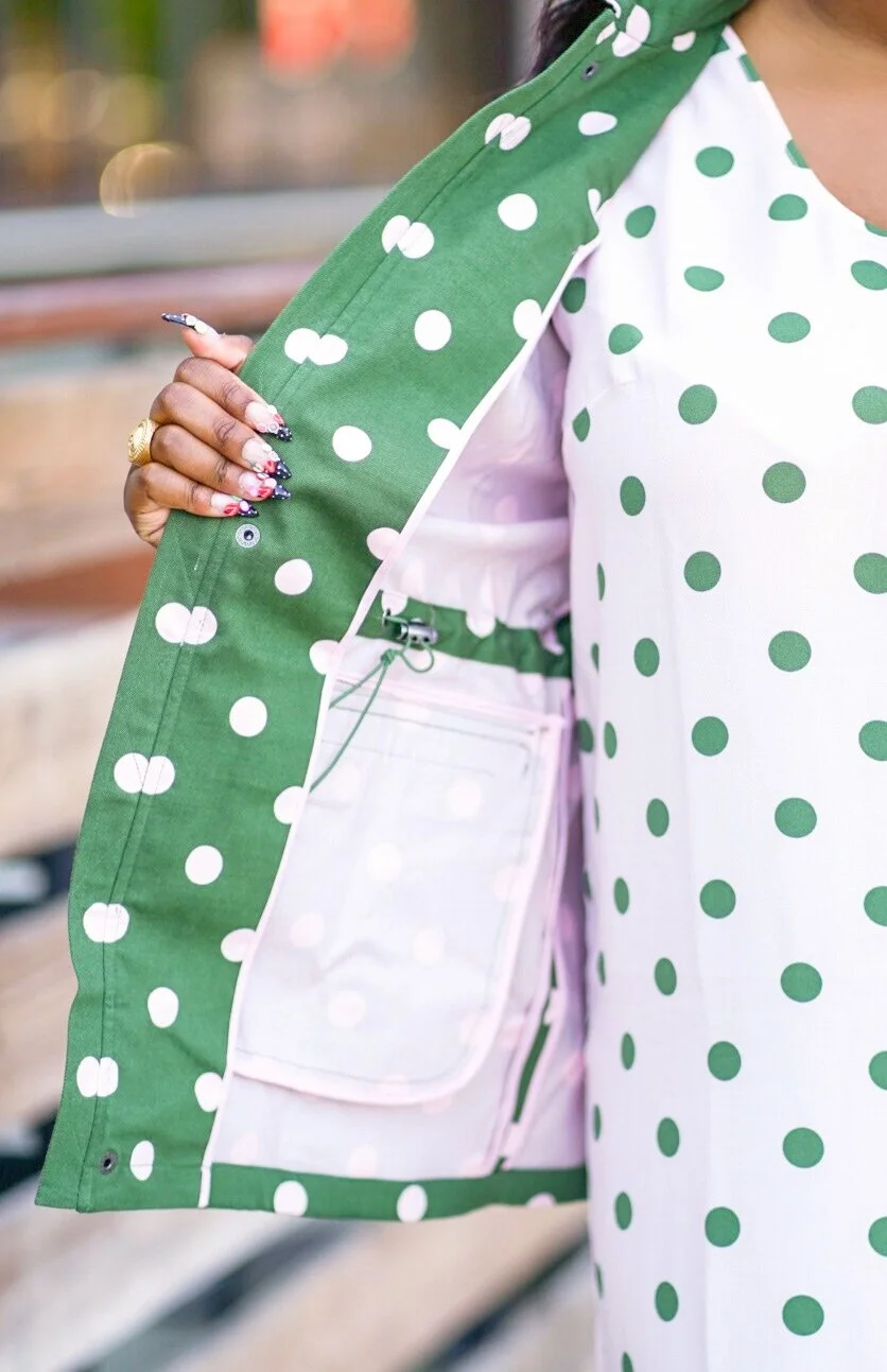 The first items that caught my eye were these amazing polka dot pieces. This outfit is everything that I love, polka dots, pink and cargo green. I knew this jacket was going to be a staple in my closet forever because I love a good army jacket. In fact, I gone though a few already. Add pink dots, and I’m in love. I actually purchased the matching skirt, however it was not very flattering on me so I returned it and bought this dress instead. I love that both of these pieces can be worn separate or together.