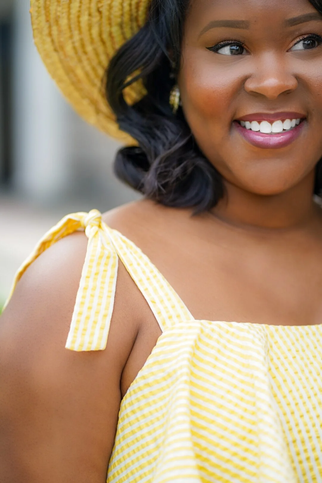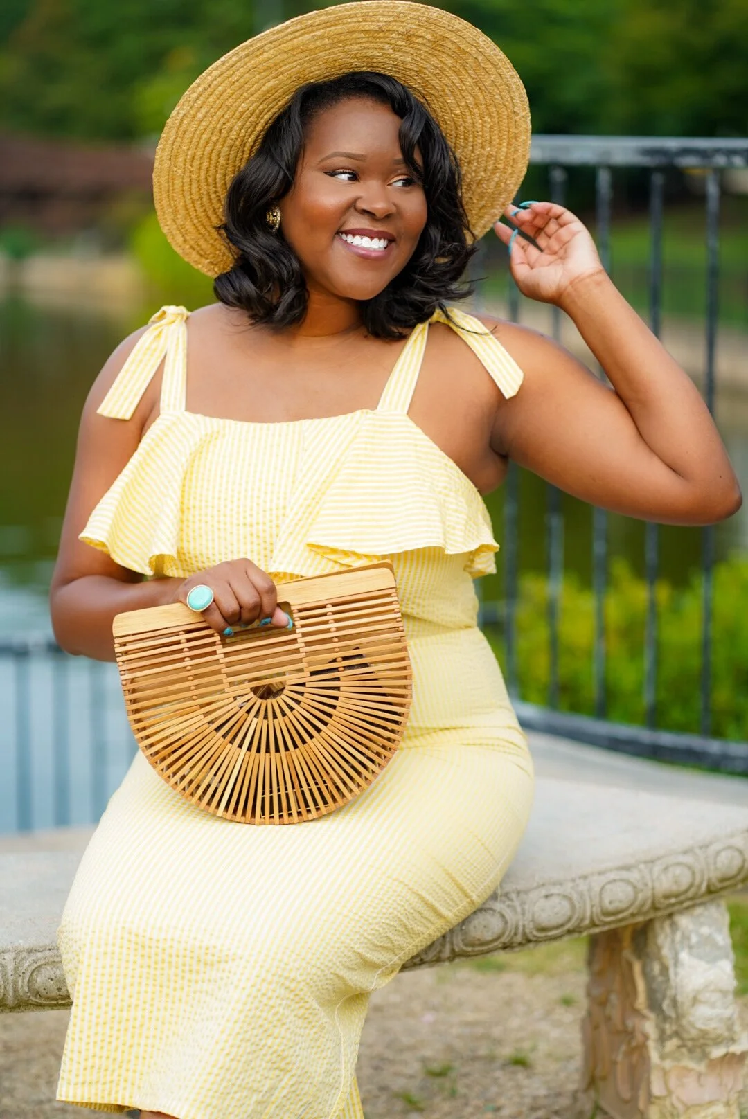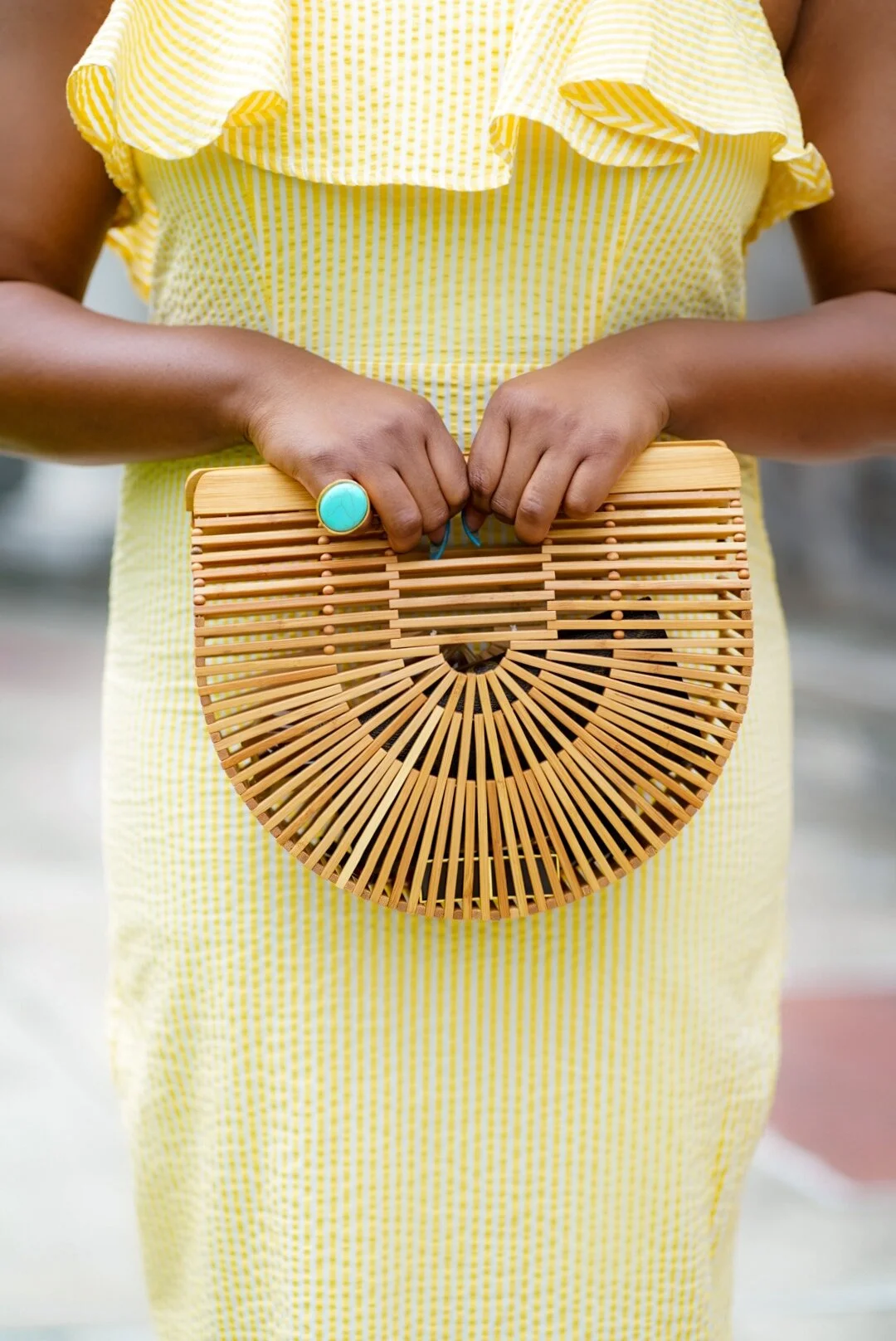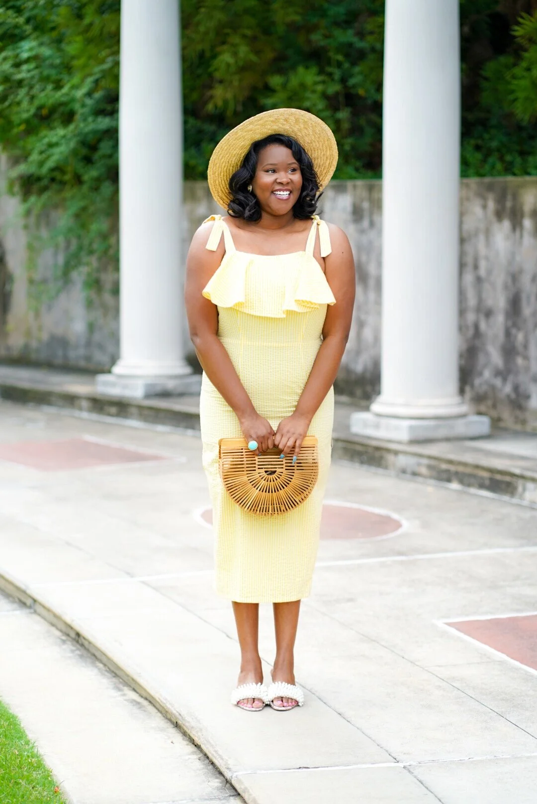 When I saw this dress, I immediately saw Audrey Hepburn running around Paris or Grace Kelly vacationing in the south of Italy. Who knew Target could make such a vintage inspired piece!?! Yes, I said Target and it was only $27.99. This seersucker dress is by A New Day and comes in four different colors; black, white, magenta and yellow. For reference, I am wearing a medium. I paired this dress with my favorite Tory Burch pearl sandals, my Cult Gaia bag, faux Chanel earrings, a vintage ring and my go-to Urban Outfitters hat.