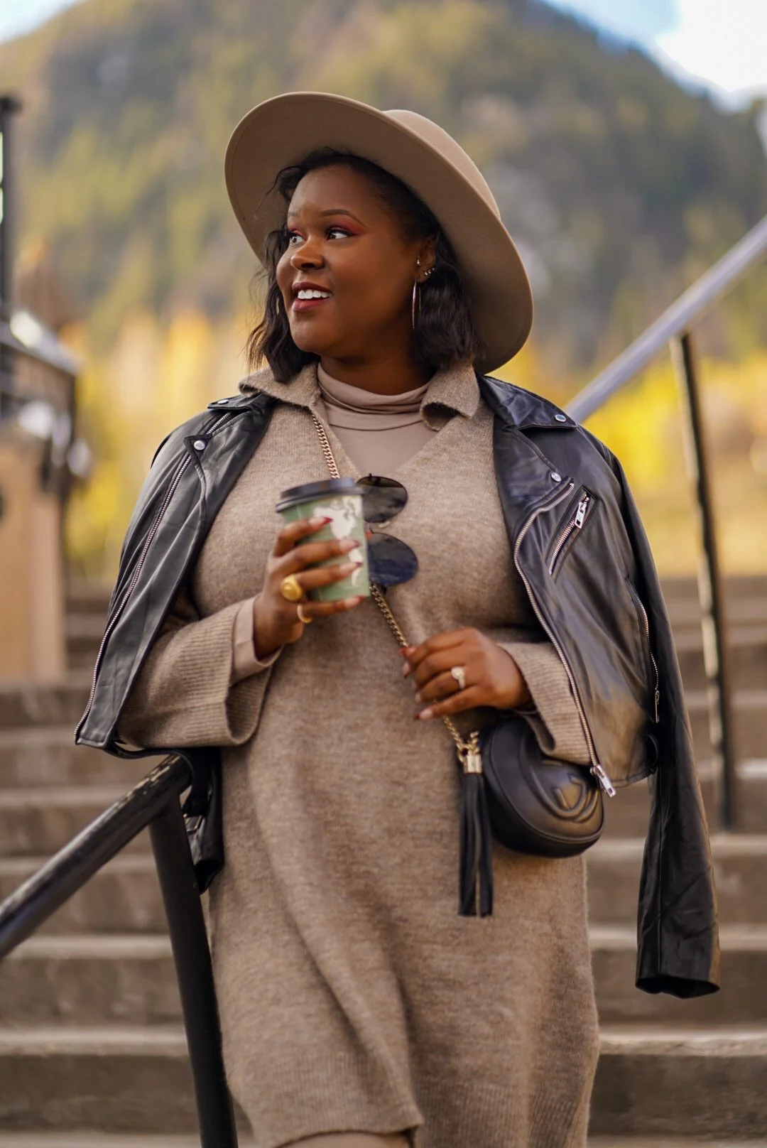 Our first full day was spent exploring downtown Aspen. I wanted to feel warm yet comfortable and I saw these pieces at H&M and thought they would be great for sightseeing. For this dark beige knit dress, I paired it with matching leggings and a turtleneck. For fall, I really love wearing shades of beige and off white. I think it can look so chic in Fall. And since it’s Aspen, I had to pair my look with some Gucci. Although the weather was nice, I threw on a Who What Wear Moto jacket earlier in the day for some warmth.