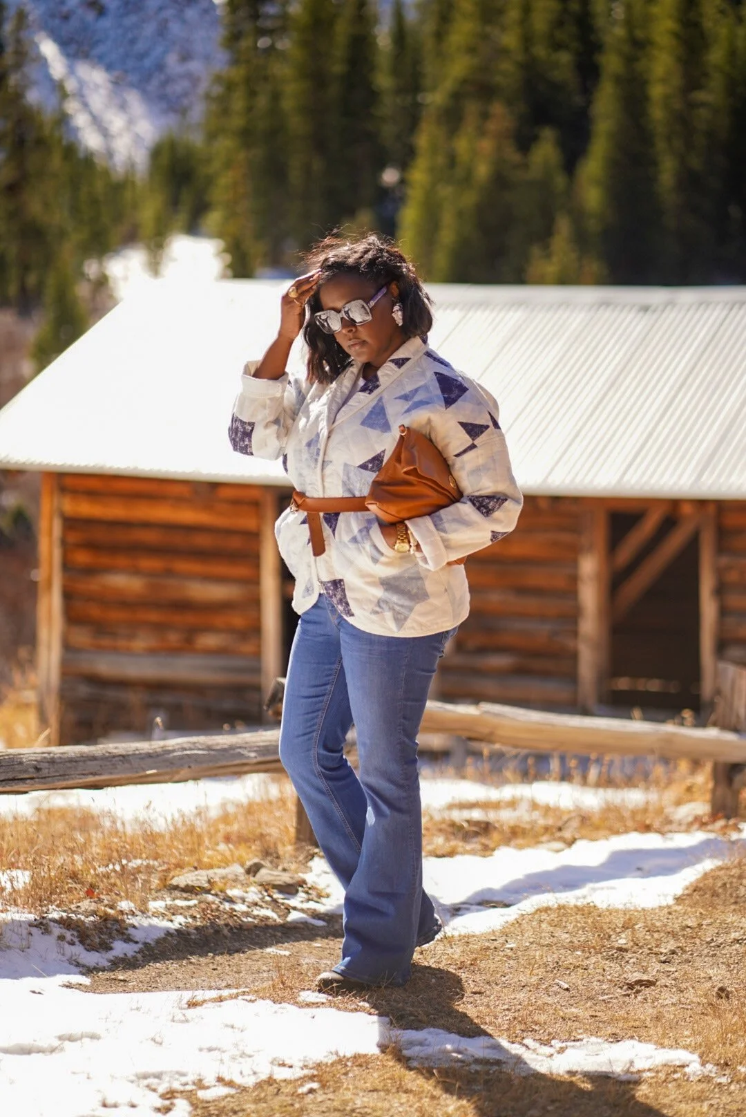 On this day, although it was a chilly, the weather was beautiful. I wore this quilted patchwork Anthropologie jacket that was comfortable and kept me warm. I paired my look with my favorite flare jeans, some durable booties for the snow, big earrings and a belt to accent my waistline. When I saw this quilted jacket, I was unsure. It literally took me two weeks to make up my mind, but I’m so glad I purchased it. It so unique. It does run big, I am wearing a XXS/XS for reference. I have my outfit below.