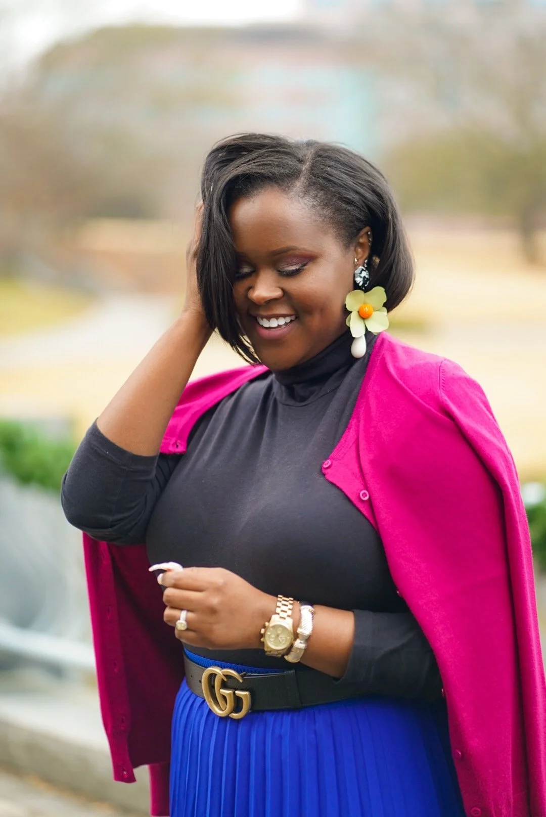 For my two Princess looks, I decided to do a 1950’s theme. For both looks, the entire outfit came from Amazon, minus the accessories. For Elsa, I found this adorable GownTown dress, which I love so much. It’s not only cute but super comfortable and stretchy. I paired the dress with some pearl snowflake earrings from Sugarfix by Baublebar. Besides the polka dots, the cape on top sold me on this dress. It’s amazing! For Anna, I chose this pleated royal blue skirt and magenta sweater, again both from Amazon. I paired it with a Gucci belt, a black turtleneck and mint green earrings. I have linked all my Amazon pieces below!