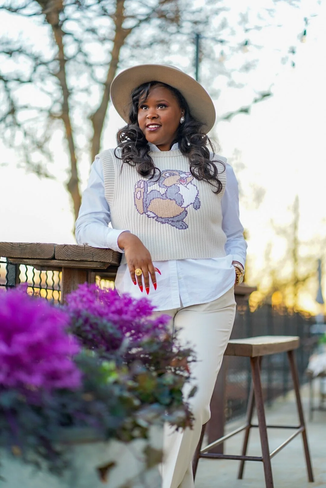 I saw this vest at Zara in February and immediately added it to my cart. And while I was in the store, I saw these cream slacks that matched it perfectly. I love a head to toe winter white/eggshell/cream (whatever y’all call it) look. There’s something so chic about it. I also think wearing a similar color at the bottom, makes your eye focus on Thumper. Because this a character, it would be easy to pair this vest with some jeans for a casual look. However I think the way I’ve styled it here, you can rock to work or at dinner etc... It definitely gives the vibe that “you like fashion, but you don’t take it too seriously.”