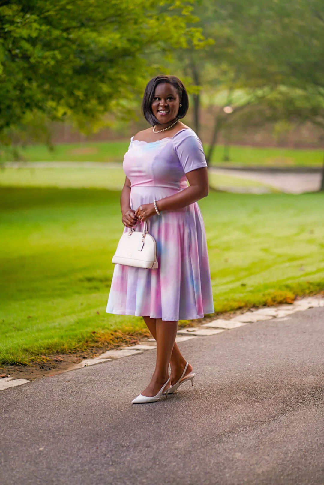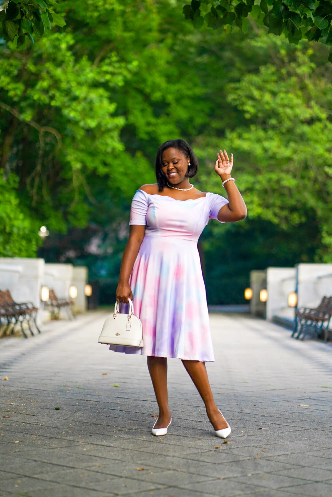 Honestly I had to rack my brain on how to pull this look off without purchasing two dresses. Luckily, I found this fun tie dye pink and blue off the shoulder dress on Amazon! It’s super affordable, comfortable and comes in a lot of different colors and patterns. I’ve linked it below.