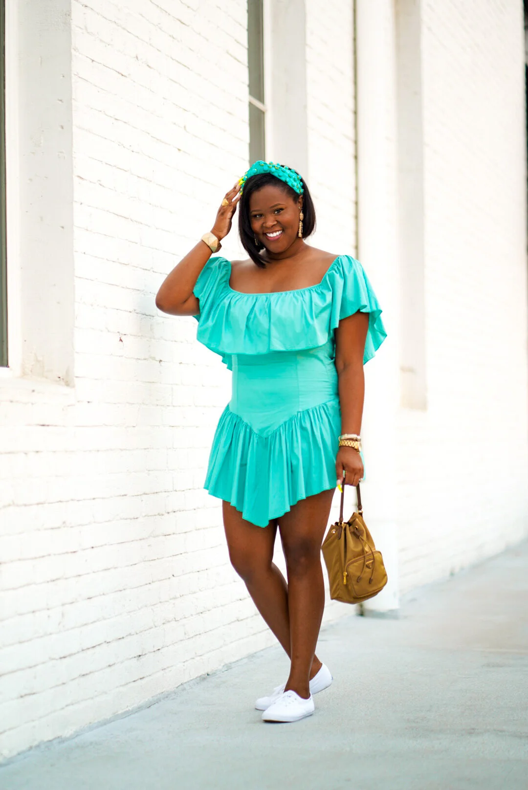 Missguided Poplin Ruffle Mini Dress // Lele Sadoughi Turquoise Headband // Prada Nylon Bag
