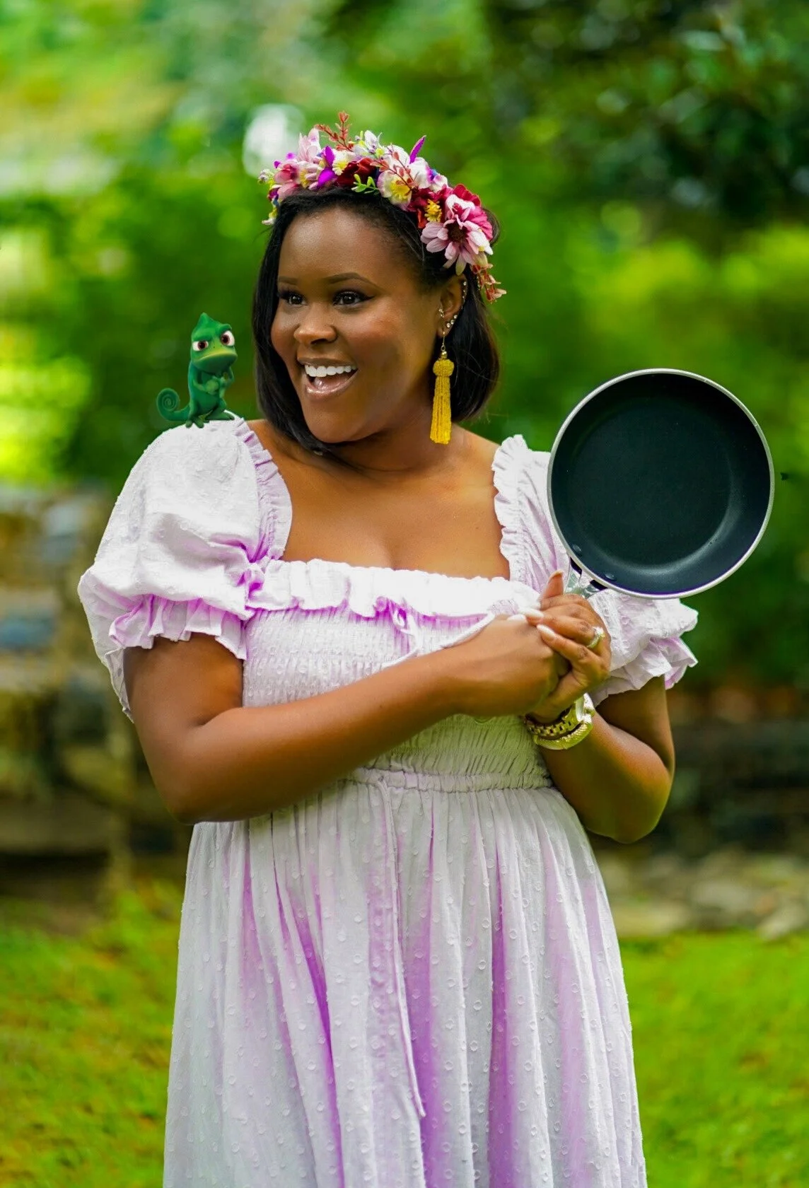 To come up with my Rapunzel look, I turned to Amazon. I wanted to find a look that resembeled her dress but also felt true to my style and something I would wear again. This flowy lavender dress is perfect. I actually have loved this specific dress for a while and now I want it in every color. I honestly think this a great summer dress option, so take notes for next year people! For the floral headband, I did modify it by adding small yellow flowers to make it feel more “Tangley.” The saddest part of my look is the lack of long hair. I cut mine off in July because it was so hot. I thought adding the floral headband and these long yellow beaded earrings, it could be a fun interpretation of her hair. I live in the south and ain’t nobody got time for seventy foot long hair. No ma’am.