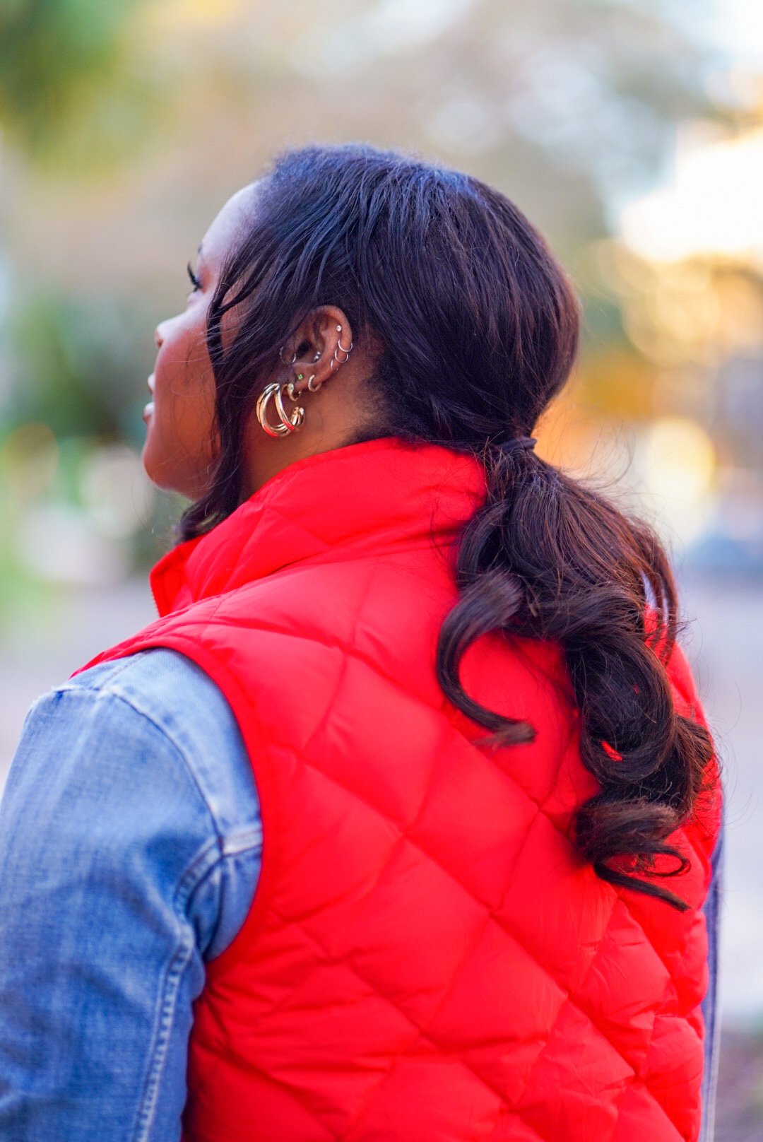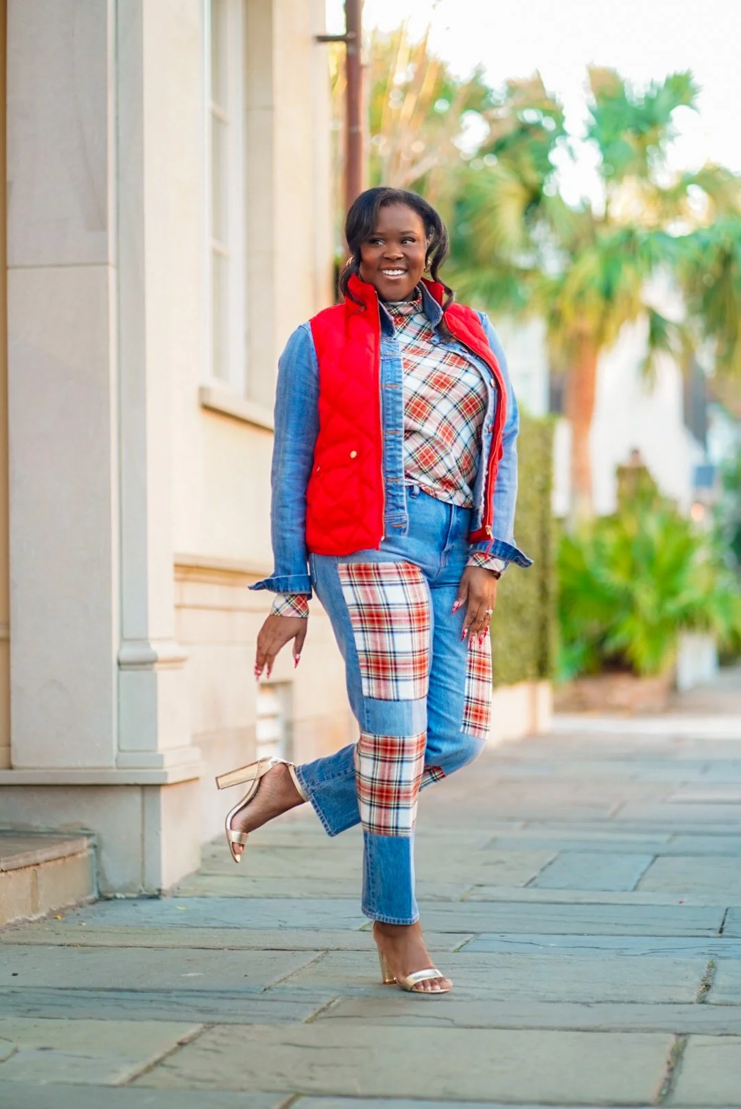 For the past few years, almost every holiday season I have done a J. Crew tartan look. I am a fan of J. Crew all the time, however, when they release their holiday tartan, I splurge and this year was no different. The first piece that caught my eye were these jeans. Surprisingly, I have never owned a pair of denim from J. Crew, I tried before but I don’t really like the fit, or the cost. When I saw the patchwork tartan pattern, I couldn't pass them up...plus they were on sale. I ended up having to order two sizes because the first pair was way too big. I sized down and they fit, but these jeans have no stretch to them at all. I paired them with the matching tissue turtleneck in the same print (also purchased at the same time and on sale), my favorite J. Crew denim jacket and J. Crew puffer vest.