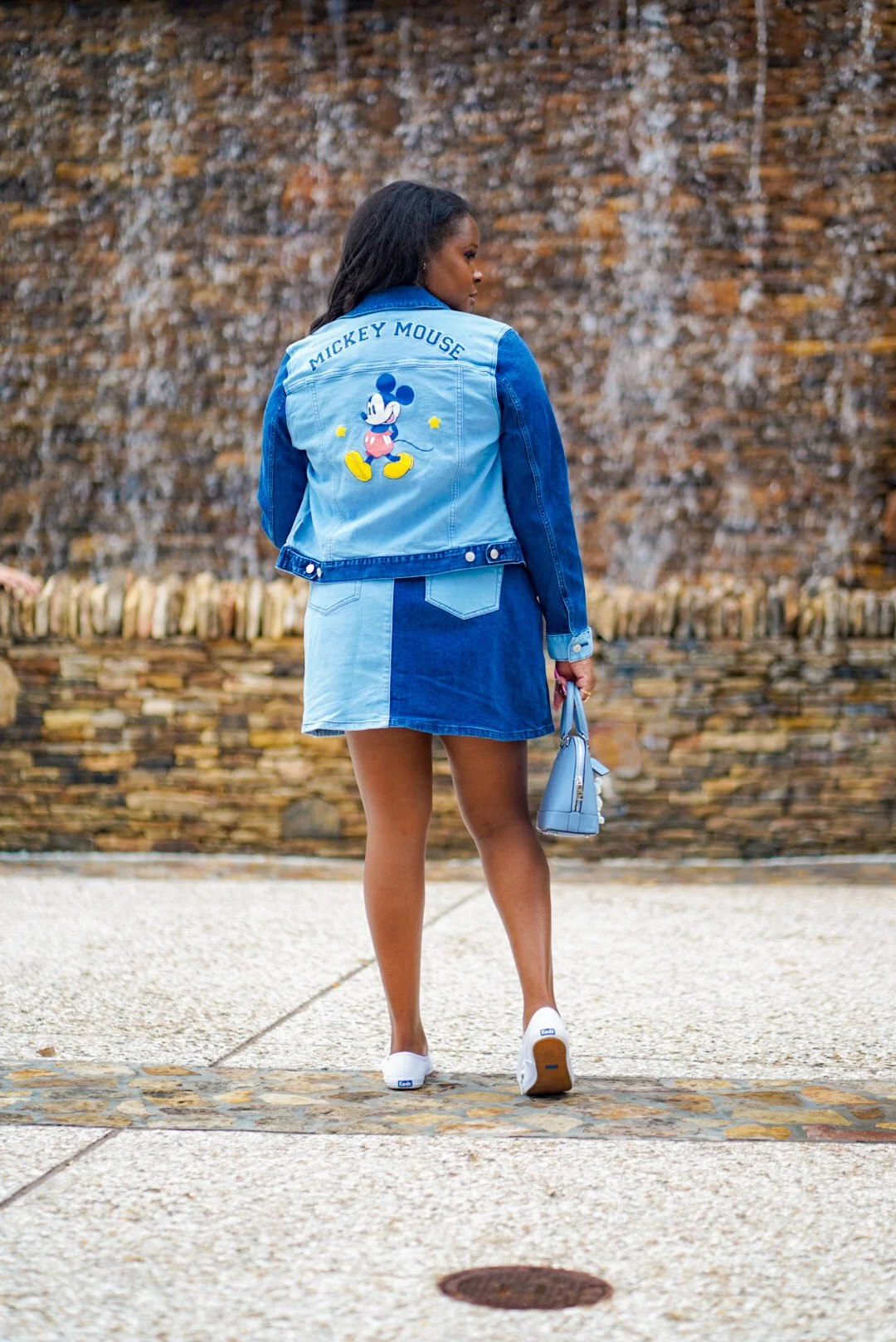 I saw this adorable set on shopDisney last month and knew it had to be mine. This look is made by Her Universe. I loved the two toned denim dress and the matching Mickey jacket. They even designed a matching pair of denim pants that match the jacket. I paired my look with a plain white t-shirt, a blue Coach purse and my sparkly Mickey Baublebar bag charm. I wore it Disney Springs and every store we walked into someone working complimented the look…especially the stores the pieces were selling in.
