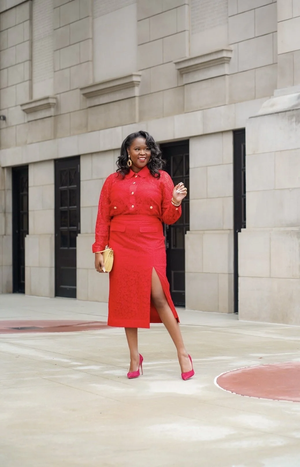 This year, I purchased this red lace set that I am wearing below. I ill be wearing it to the Atlanta History Center holiday party with my best friend. I paired this all red look with gold accessories to bring out the gold buttons on the top. The cropped lace top comes with a matching camisole underneath, so no worries about flashing anyone. The skirt is fully lined and the slit adds a touch of sexiness without showing too much. The cropped lace top comes in three colors; red, black and black & white. The skirt comes in black and red. I may end up purchasing the black & white top with black skirt at a later date. These pieces are classic and timeless and a great addition to anyones wardrobe. The best part about this outfit is, it’s currently on sale! Yes, on sale. I purchased mine when it was 60% off, which makes it even better. I have linked the items below.