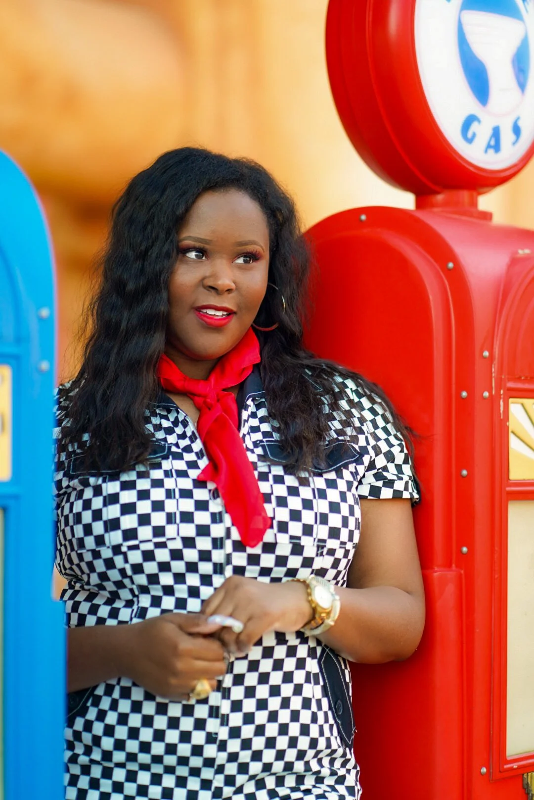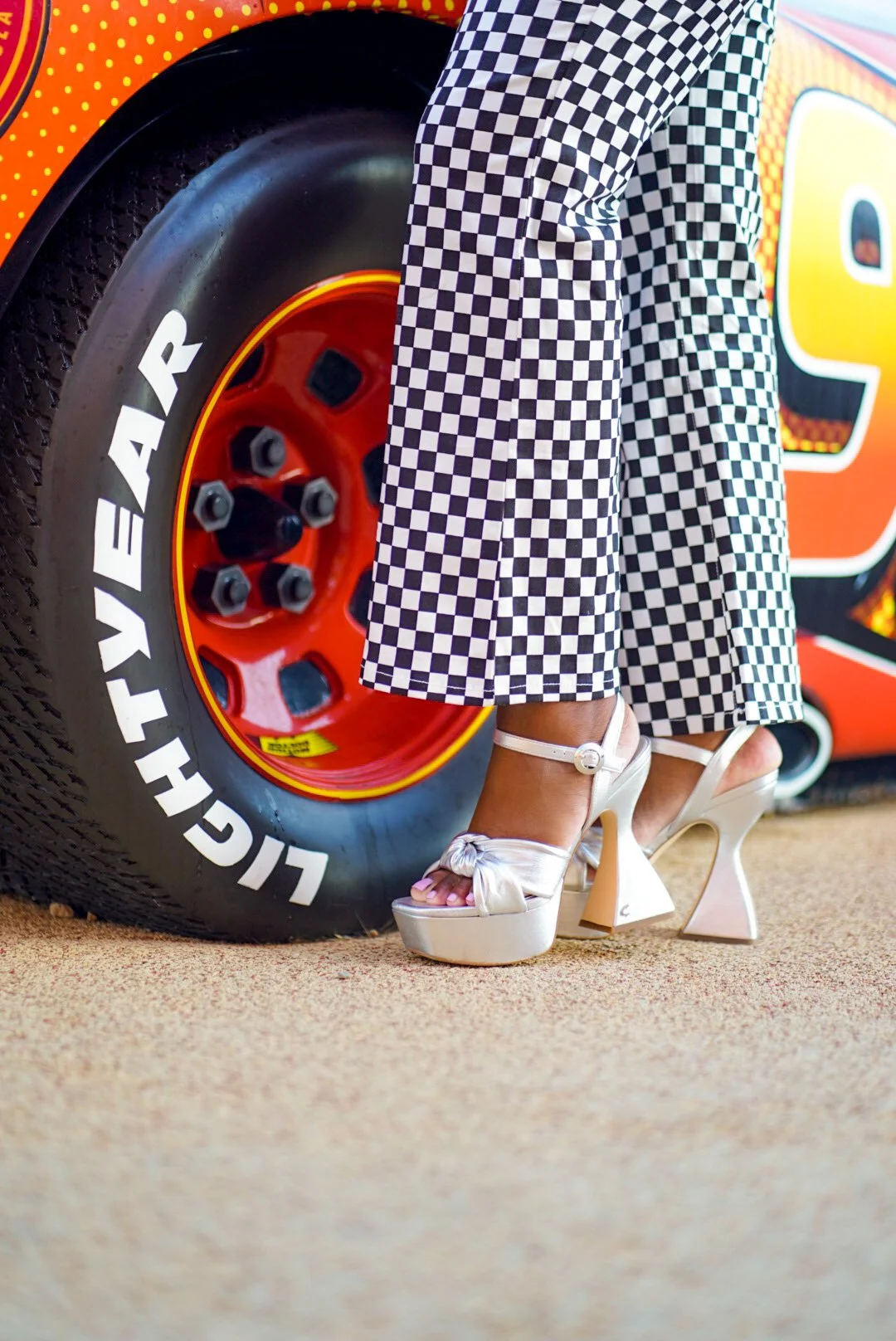 For this Disneybound, I wanted to go for a more retro feel…kinda of 60/70s vibe. Finding this jumpsuit really did the trick. Besides the checkered print and zip up the front, I really love the flared bottoms. Additionally, I thought this outfit would look cool with some platforms. I threw on a red scarf and some big hoops, and below is my final look. I really loved how this Cars Disneybound came out and I like that it can transition outside the Disney sphere. If I ever get into Nascar or Formula 1, this outfit will be on repeat!