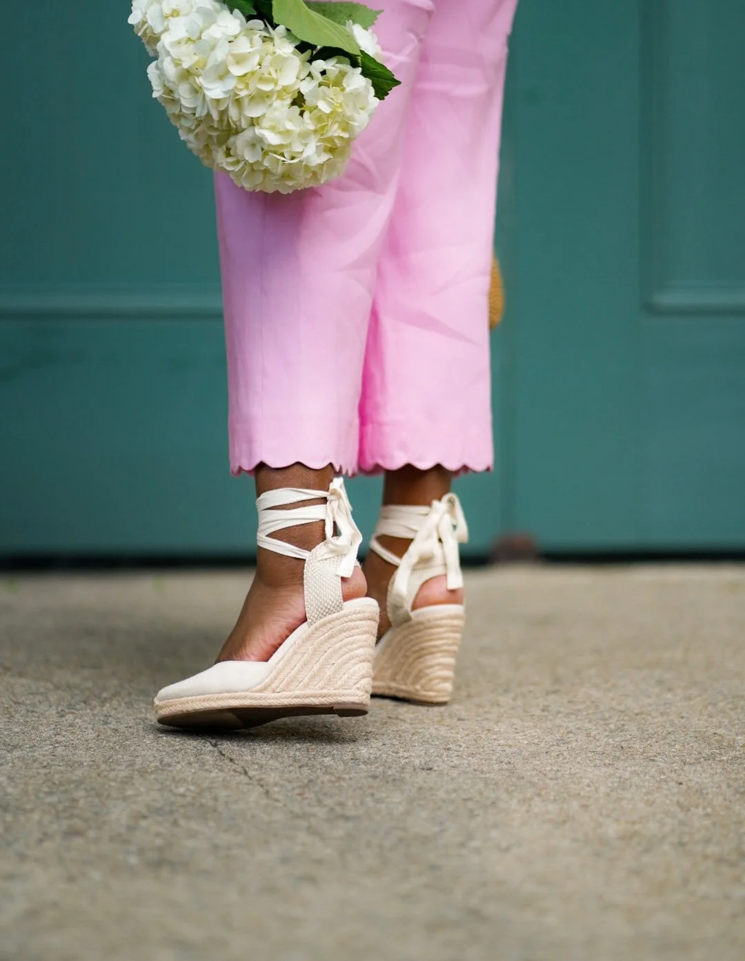 I purchased four pieces, two complete looks, from the collection. The first look is the all pink linen set with scalloped edges. I paired this look with LoveShackaFancy earrings and J Crew espadrilles. However, the one thing I would change about this entire outfit is the material. Linen is so unpractical in a lot of ways. With linen, the minute you sit down, you wrinkle all up. I was so wrinkly, it was almost embarrassing to walk around. I spent more time editing out wrinkles then I did actually wearing the outfit. This set comes in another print with shells and I think it would have been better because the creases and folds wouldn’t have shown so much.