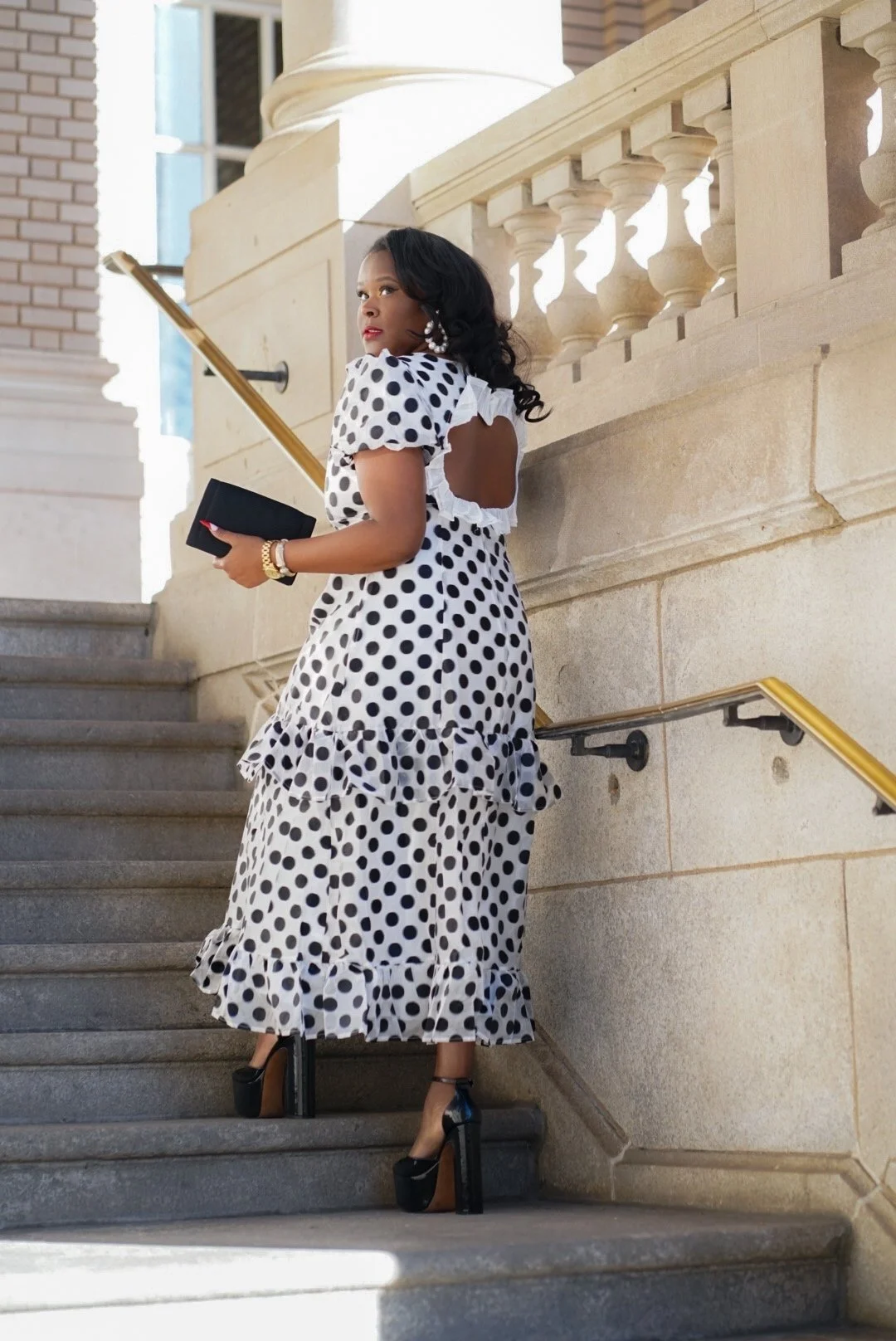I don’t know about you, but polka dots are a must-have print in my closet. Polka dots, cheetah print and stripes are neutrals to me and they go with everything. Today (January 22nd) is National Polka Dot day and to celebrate I am wearing this adorable dress purchased from ASOS. What truly caught my eye was the heart shaped cut out on the back. I thought it was so unique and added a nice surprise. I also am a sucker for a good puff sleeve. So, between the heart cut out, the polka dot and puff sleeves…this dress is tres chic! I paired my look with over the top sky high platforms from Jessica Simpson (borrowed from my BFF/Photographer), a vintage clutch and giant pearl hoops.