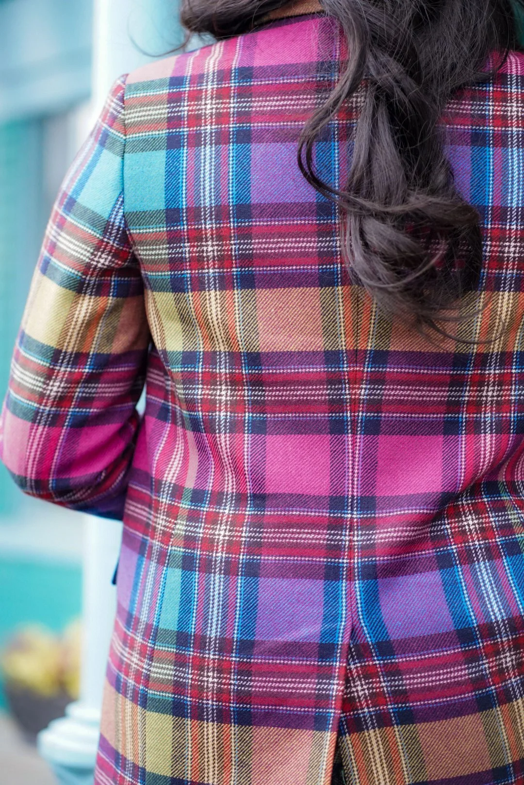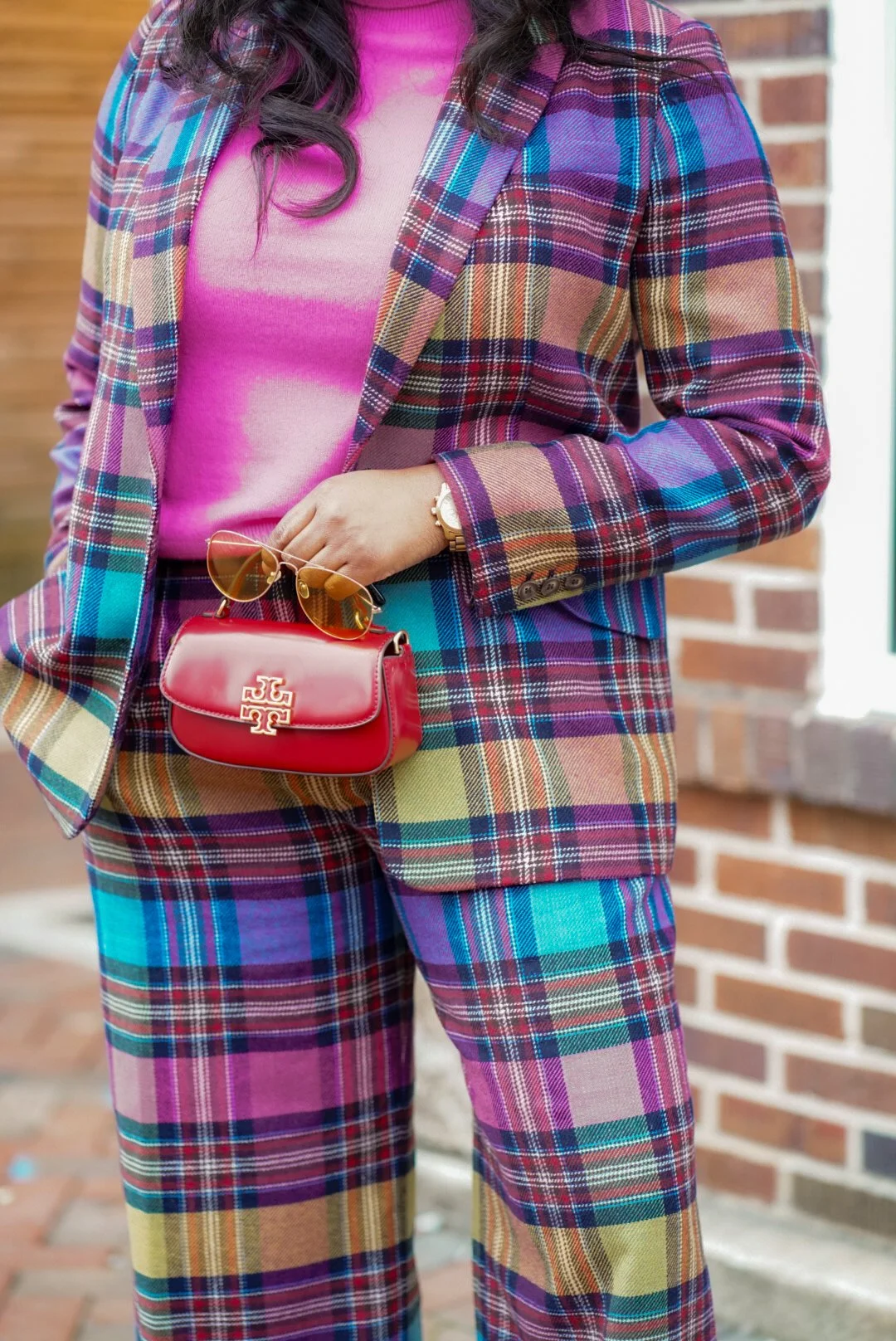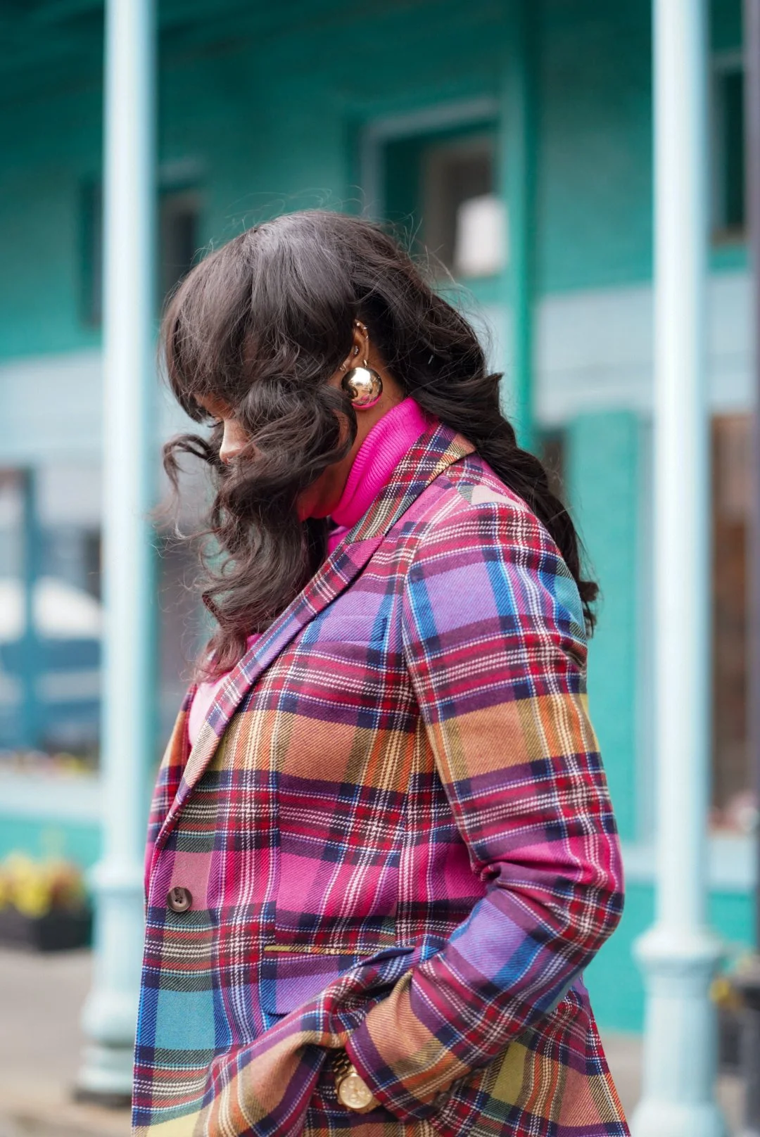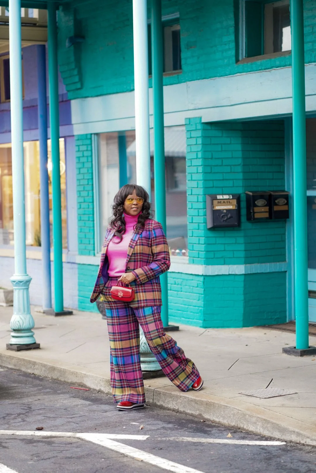 There’s something about wearing color in February that just feels rebellious in the best way. While everything outside is gray and cold, this suit feels like joy. The pink turtleneck feels like a hug. The rainbow plaid feels like personality you don’t have to explain — it just shows up and takes up space.